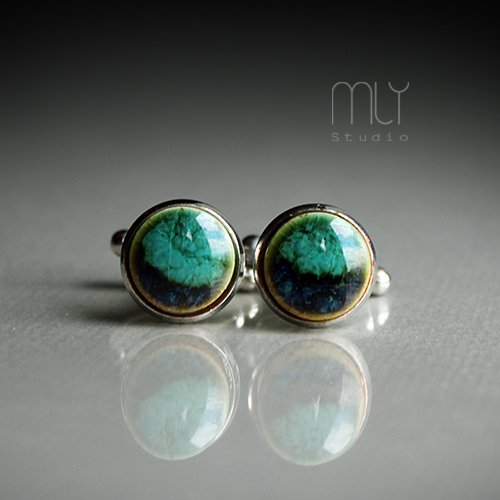 Ceramiczne okrągłe spinki do mankietów, ręcznie wykonane z delikatnej gliny kamionkowej, jednostronnie szkliwione mieszanką zielonych szkliw z efektem plamek, w oprawie w kolorze srebrnym. Średnica oczka ok. 12mm. Polecam