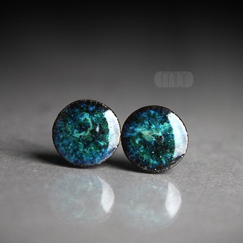 Ceramiczne klipsy, ręcznie wykonane z delikatnej gliny kamionkowej, jednostronnie szkliwione mieszanką zielonych szkliw, zapięcia w kolorze starego złota. Dostępne również w formie sztyftów. Średnica ok. 13mm.Polecam