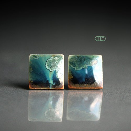 Ceramiczne kolczyki w formie sztyftów, ręcznie wykonane z delikatnej czekoladowobrązowej gliny kamionkowej, jednostronnie szkliwione mieszanką brązowych i błękitno zielonych szkliw z efektem plamek, na sztyftach w kolorze srebrnym. długość ok. 11mm. Polecam