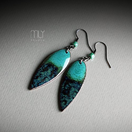 Oryginalne i efektowne ceramiczne kolczyki w formie gronek, ręcznie wykonane z gliny kamionkowej, jednostronnie szkliwione mieszanką zielonych szkliw z efektem drobnych plamek, na biglach w kolorze ciemnego srebra. Długość około 5cm. Polecam