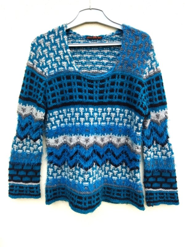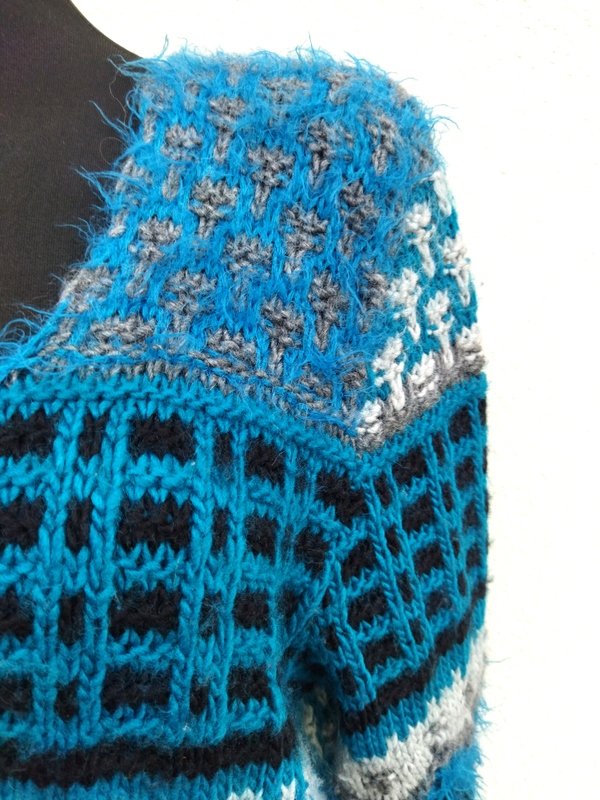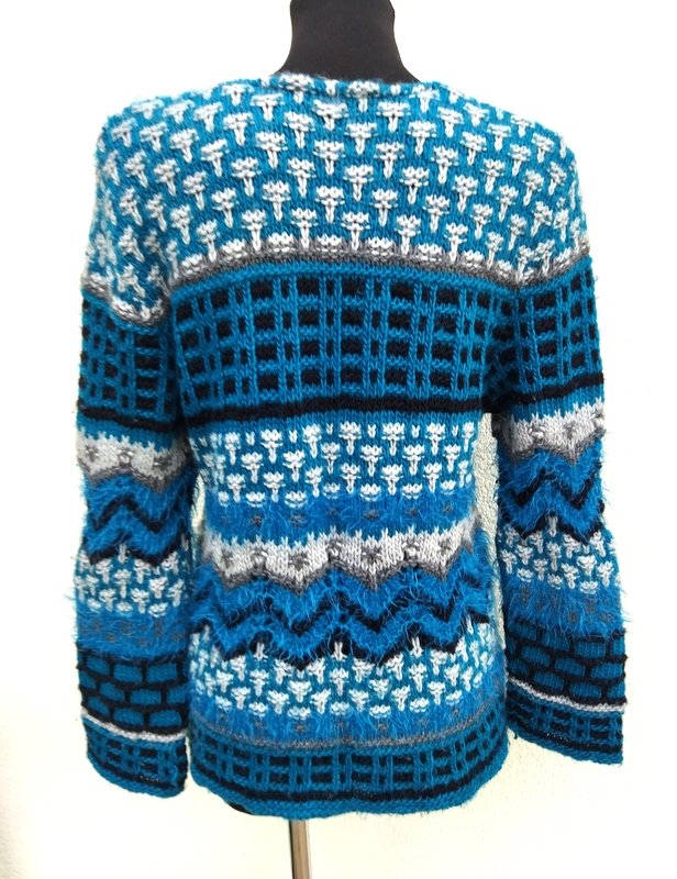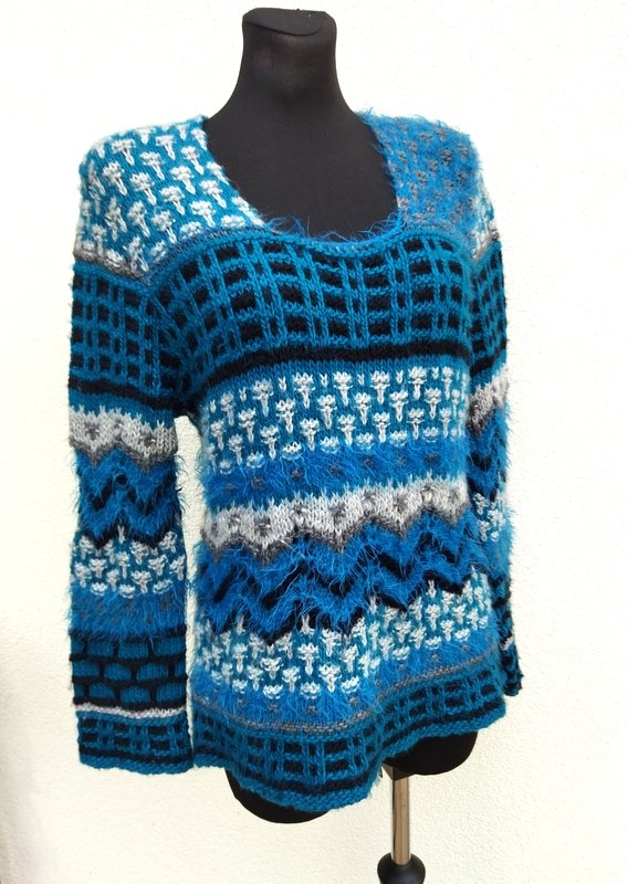 Ciekawy sweter w kombinacji różnych wzorów w tym częściowo ażurowych oraz różnych włóczek gładkich i kosmatych, w kolorystyce morskiej zieleni ( na zdjęciu wyszedł kolor niebieski), dwóch odcieni szarości, czerni i szafiru. Luźny prosty fason z owalnym dekoltem. Miły, , podatny i rozciągliwy