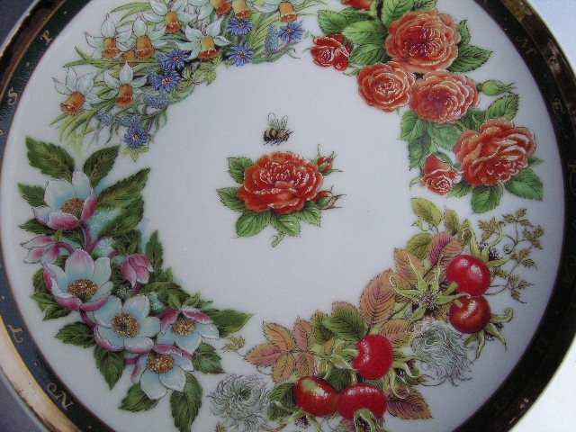 Dekoracyjny Talerzyk Porcelanowy do powieszenia lub postawienia. Specially designed by GILL TOMBLIN - ALL SEASONS. Ciekawe zdobienie - jakby wianek roślin charakterystycznych dla czterech pór roku,wewnątrz pszczółka i róża,rant zdobny,złocony. Tło białe na błyszcząco szkliwione. Wzór jakby nieco wystawał spod szkliwa,satynowy. Z tyłu profesjonalny uchwyt do powieszenia.