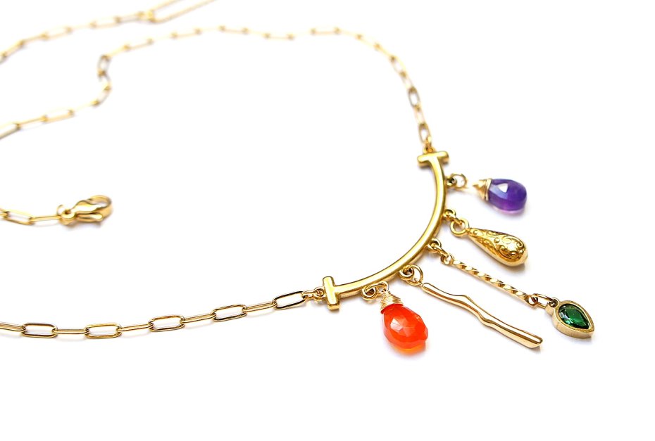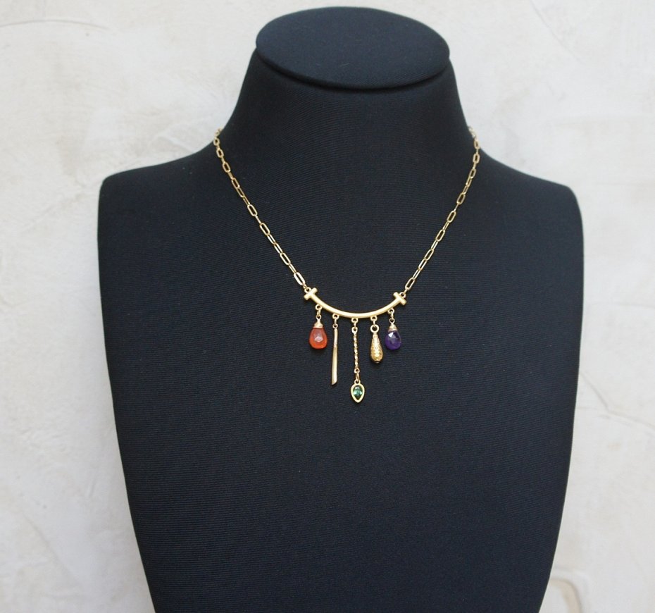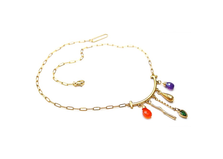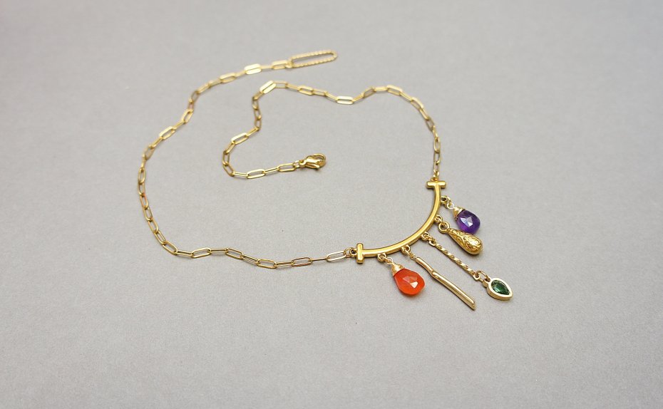 Naszyjnik wykonany w całości ze stali szlachetnej w połączeniu z naturalnym ametystem, karneolem, cyrkonią w oprawie. Całkowita długość naszyjnika ok. 43 cm.