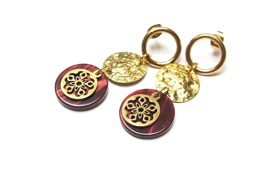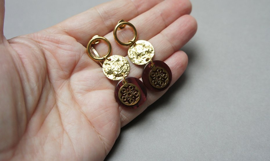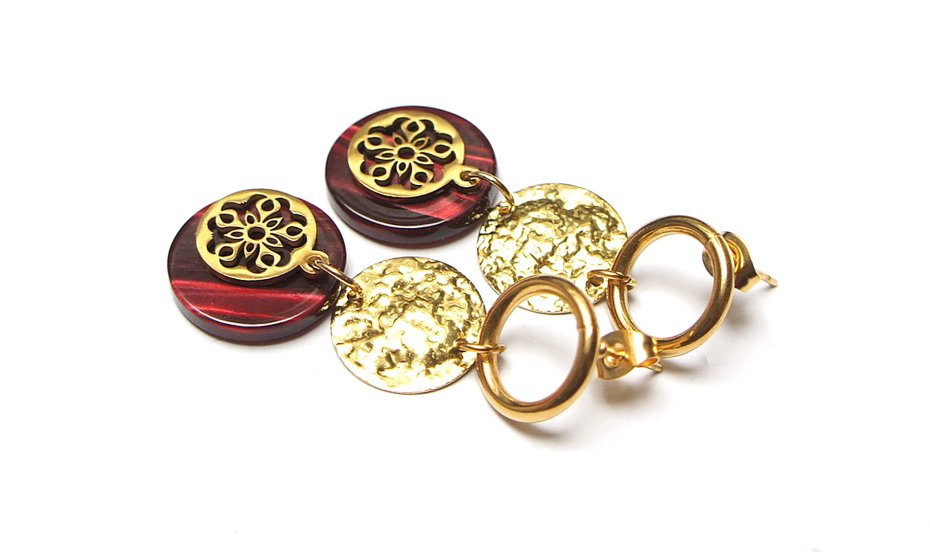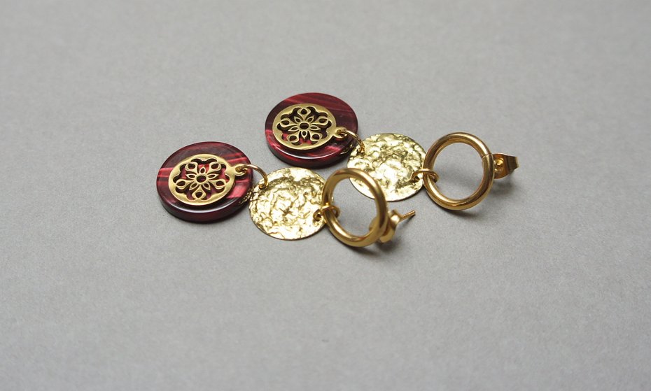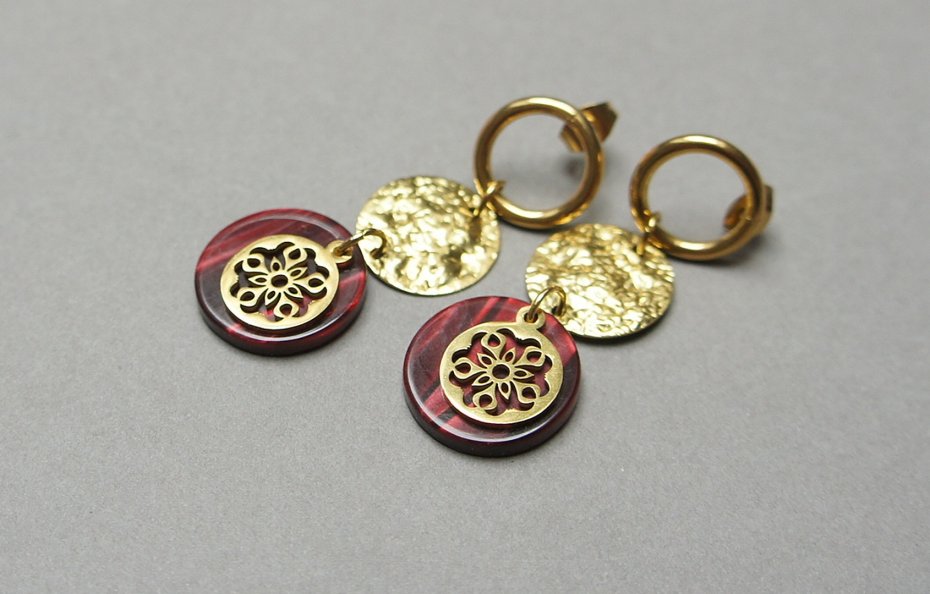 Długie kolczyki wykonane ze stali szlachetnej pozłacanej, gniecionych blaszek z mosiądzu oraz z monetek z żywicy [10mm]. Długość kolczyków: ok. 4,6cm.