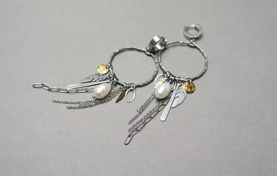 Duże kolczyki wykonane ze stali szlachetnej i stali szlachetnej pozłacanej w połączeniu z naturalnymi perłami słodkowodnymi [14mm] oraz zawieszkami . Długość kolczyków: ok. 11cm. Średnica kół 34mm.