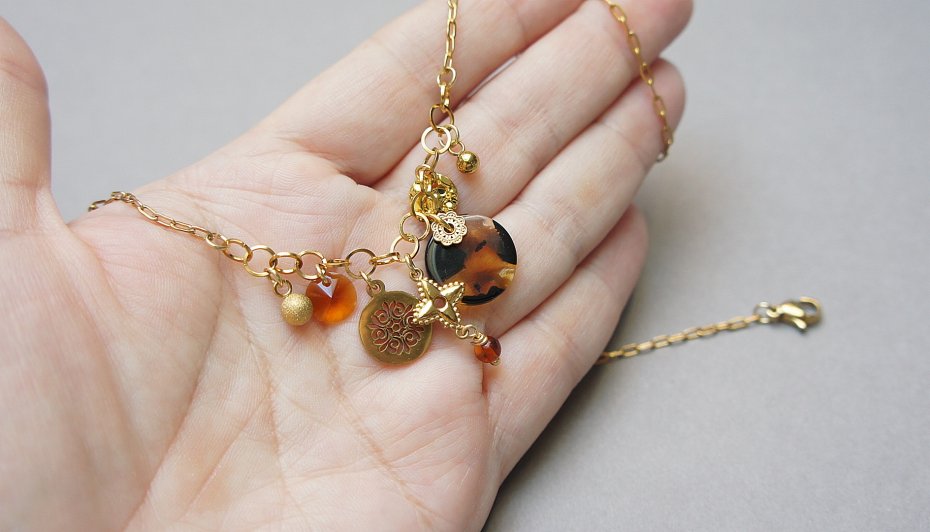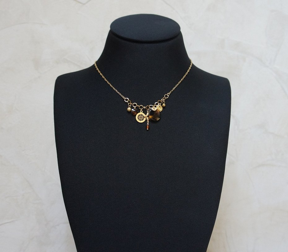 Krótki naszyjnik wykonany w całości ze stali szlachetnej pozłacanej w połączeniu z monetką żywicy [15mm], kryształkiem rivolii [8mm],kuleczką bursztynu [4mm] . Całkowita długość naszyjnika ok. 42cm. Biżuteria ozdobnie zapakowana.