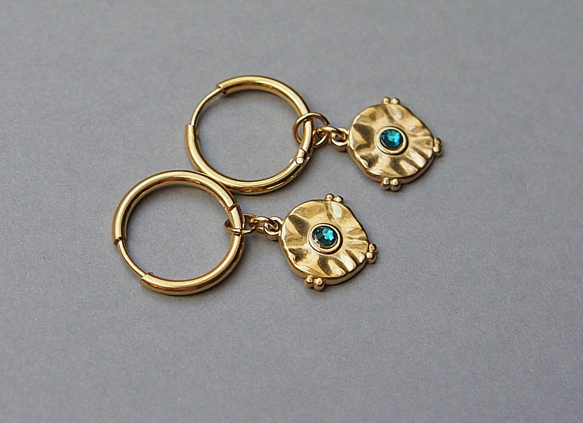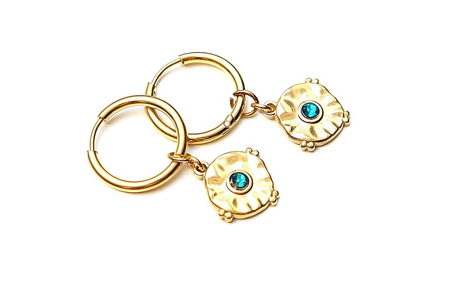 Delikatne kolczyki wykonane z pozłacanej stali szlachetnej oraz kryształków Swarovski. Średnica kół 1,5cm, średnica emblematów 1,4cm. Długość całkowita kolczyków: 3,7cm;