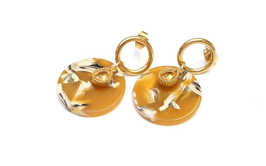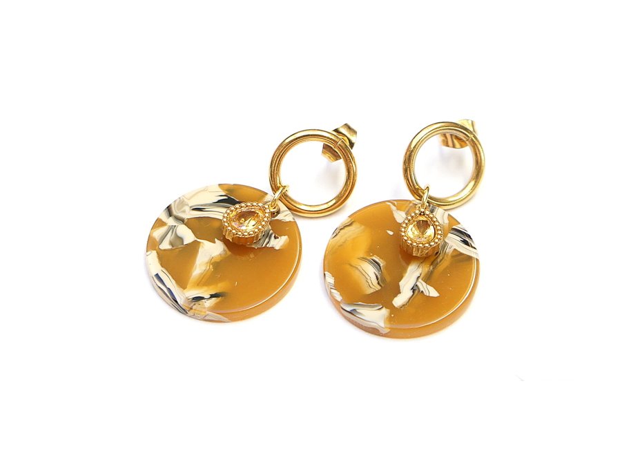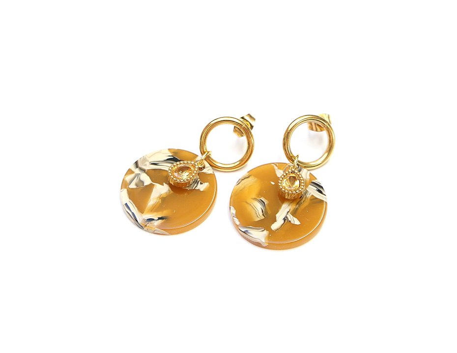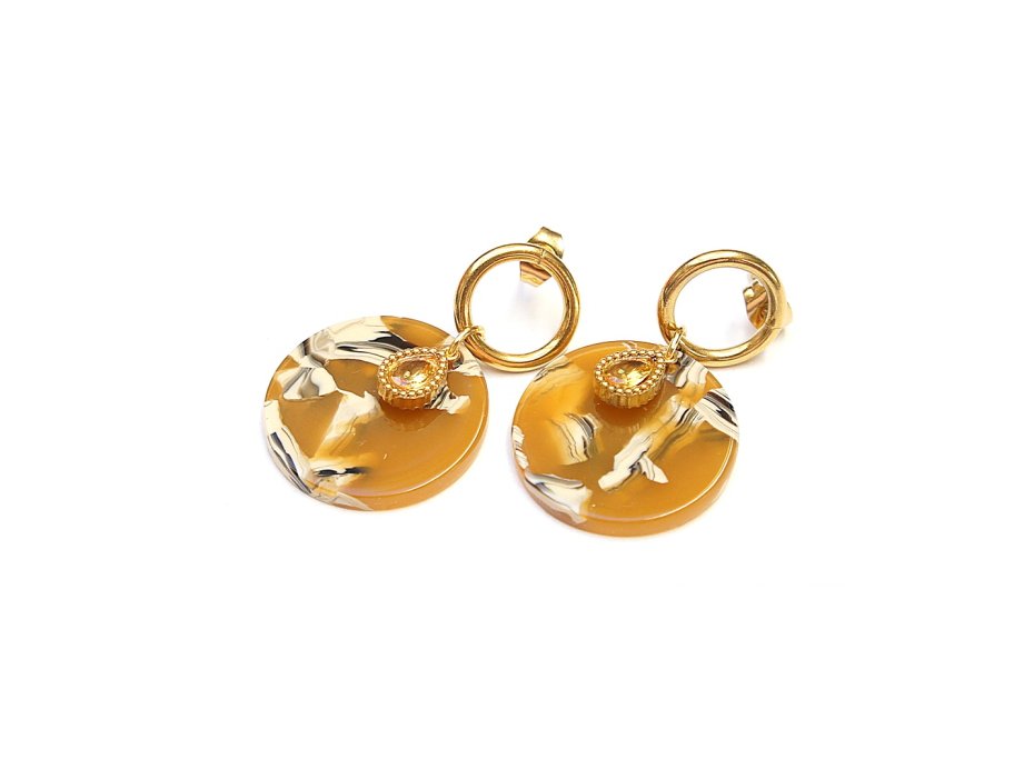 Kolczyki wykonane ze stali szlachetnej pozłacanej, monetek z żywicy [śr. 23mm] oraz cyrkoniami w okuciu. Długość kolczyków: ok. 3,8m.