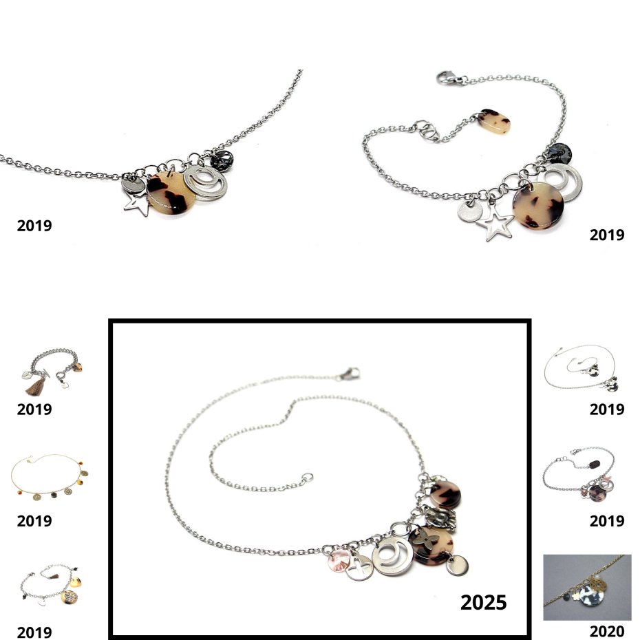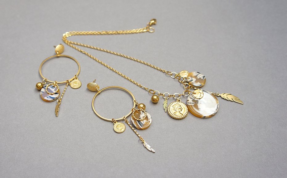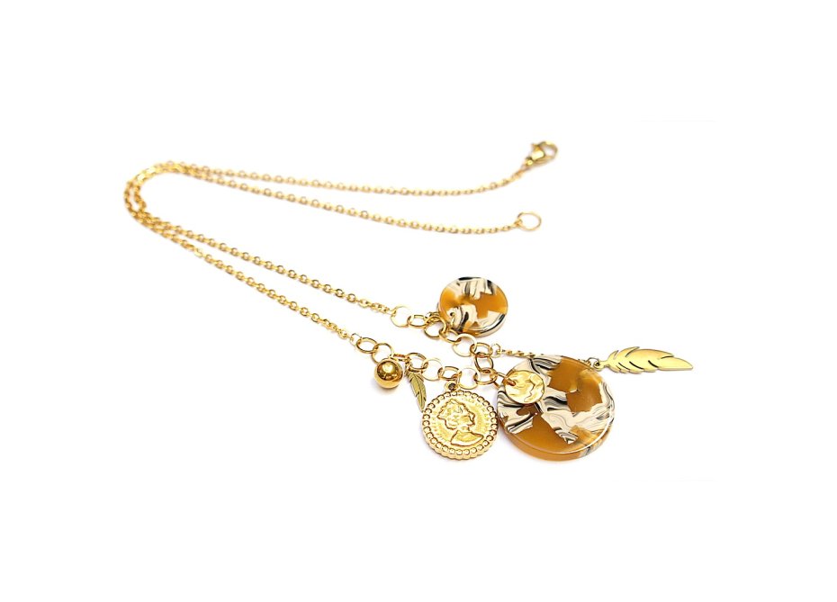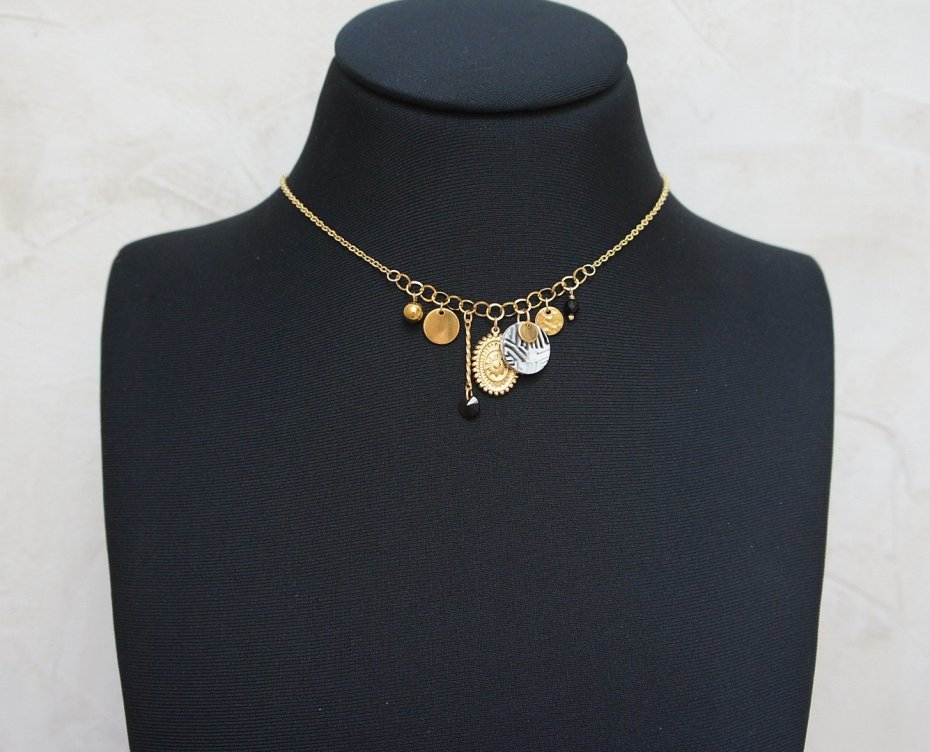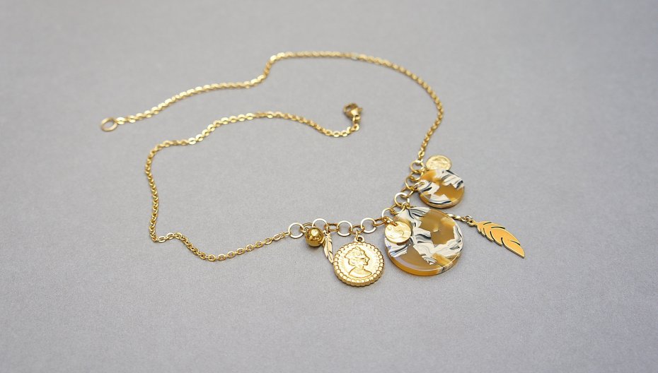 Krótki naszyjnik wykonany w całości ze stali szlachetnej pozłacanej w połączeniu z monetką żywicy [16mm i 24mm] oraz zawieszkami . Całkowita długość naszyjnika ok. 42,5cm. Biżuteria ozdobnie zapakowana.