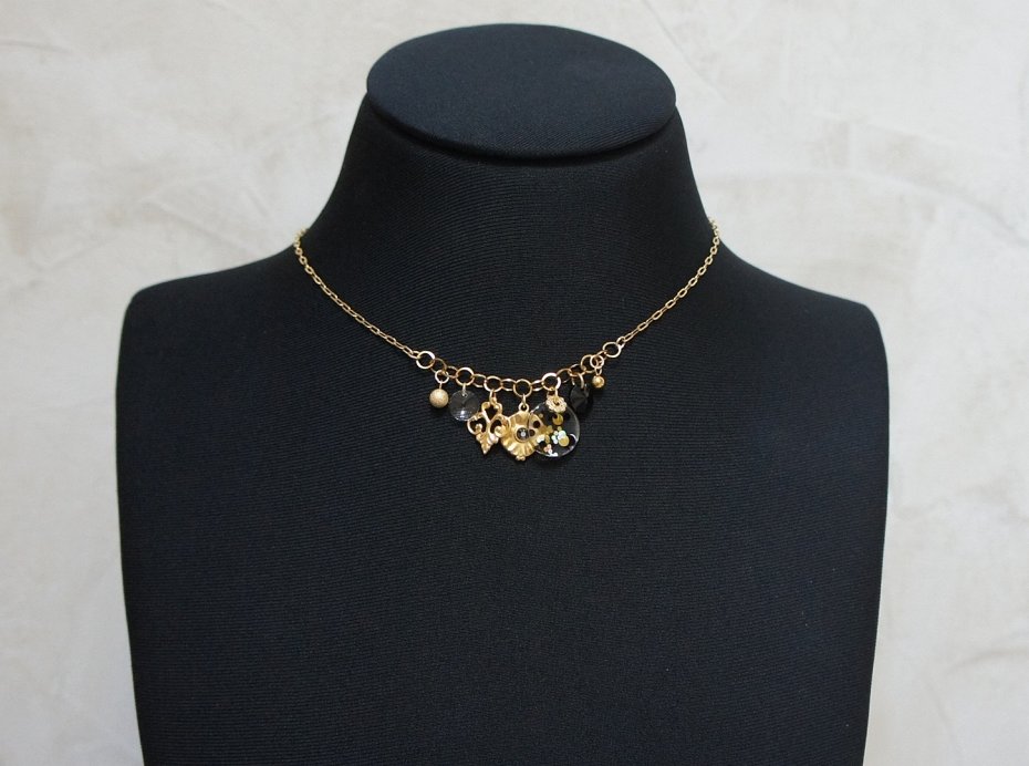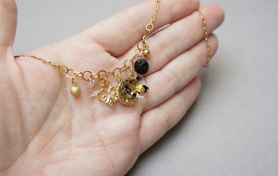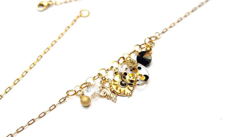 Krótki naszyjnik wykonany w całości ze stali szlachetnej pozłacanej w połączeniu z monetką żywicy [15mm], kryształkami [8mm] oraz zawieszkami (w tym zawieszka z kryształkiem Swarovski). Całkowita długość naszyjnika ok. 42,5cm. Biżuteria ozdobnie zapakowana.