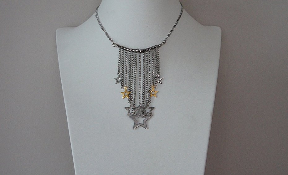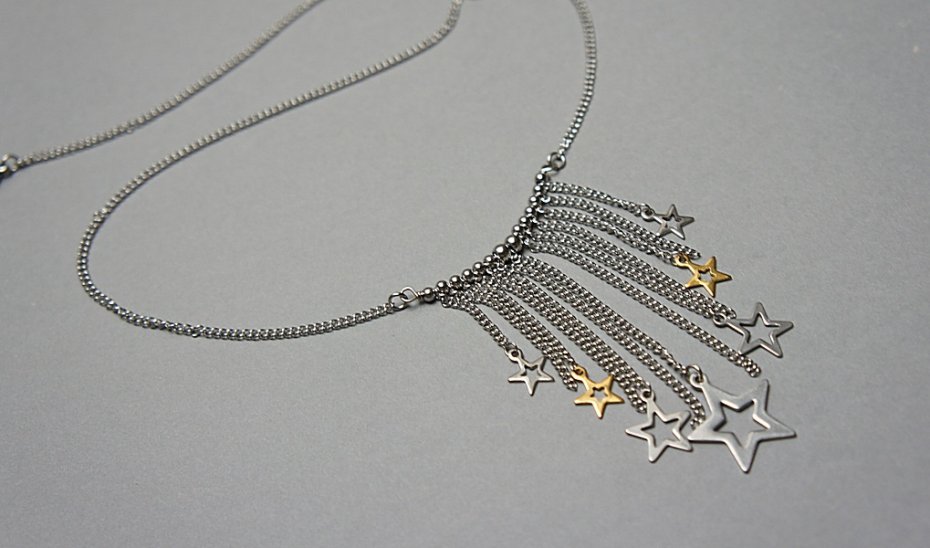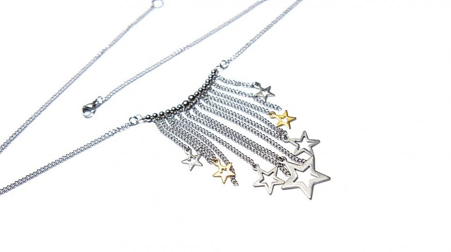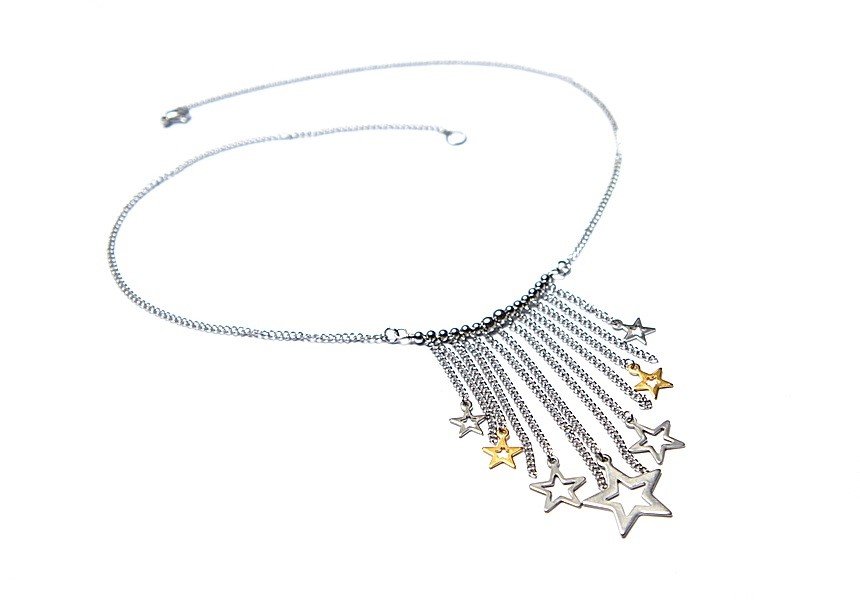 Krótki naszyjnik wykonany od podstaw w całości ze stali szlachetnej i stali szlachetnej pozłacanej w połączeniu. Całkowita długość naszyjnika 46,5cm. Biżuteria ozdobnie zapakowana.Zdjęcie pierwsze przedstawia nasze prace wykonane na przestrzeni lat .Cena dotyczy naszyjnika z kolejnych zdjęć .