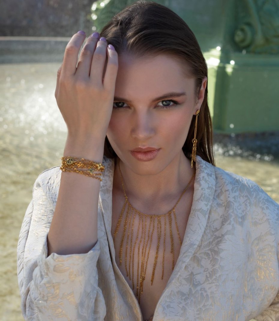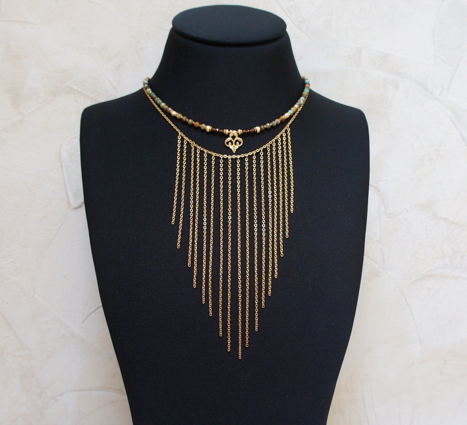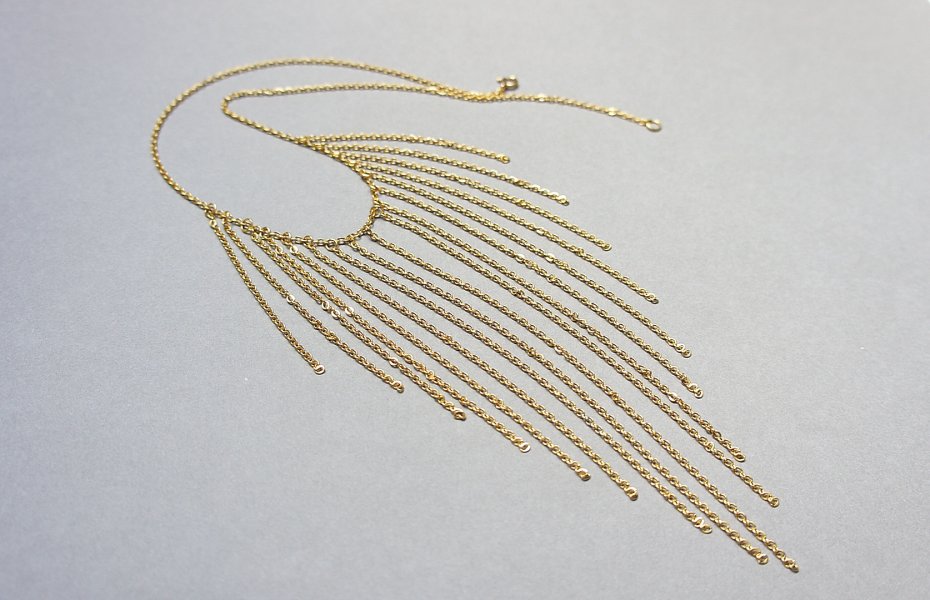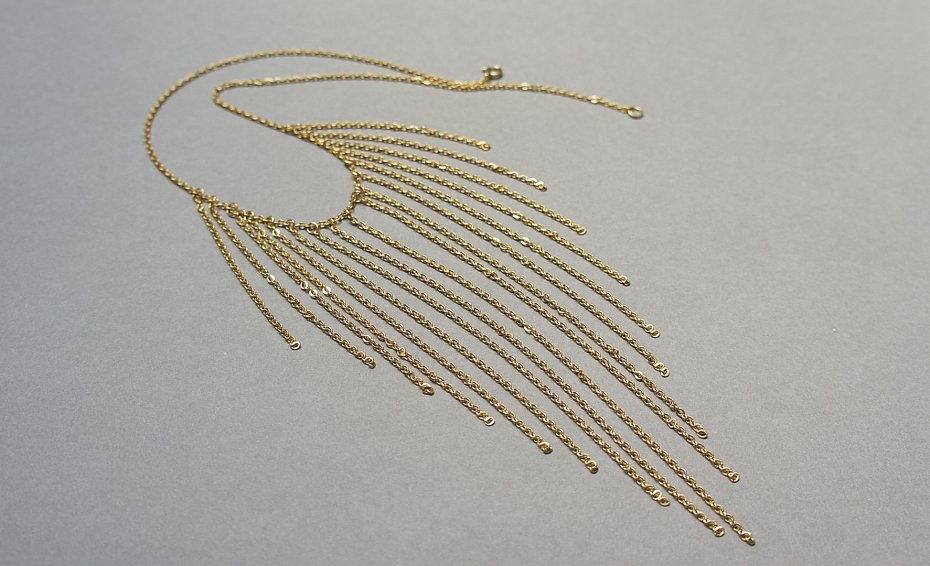 Krótki, spektakularny naszyjnik wykonany od podstaw w całości ze stali szlachetnej pozłacanej. Całkowita długość naszyjnika 44,5cm. Biżuteria ozdobnie zapakowana.