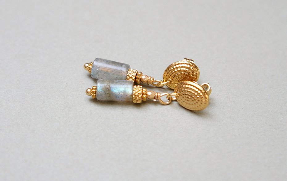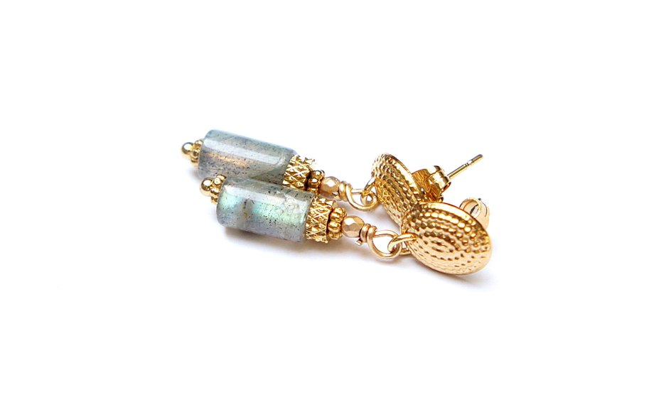 Delikatne kolczyki wykonane z naturalnych kamieni - wałeczki labradorytów [9 x 5mm], fasetowanych kuleczek matowego hematytu [2mm] oraz z pozłacanej stali szlachetnej. Długość kolczyków: ok. 3cm. Biżuteria ozdobnie zapakowana.
