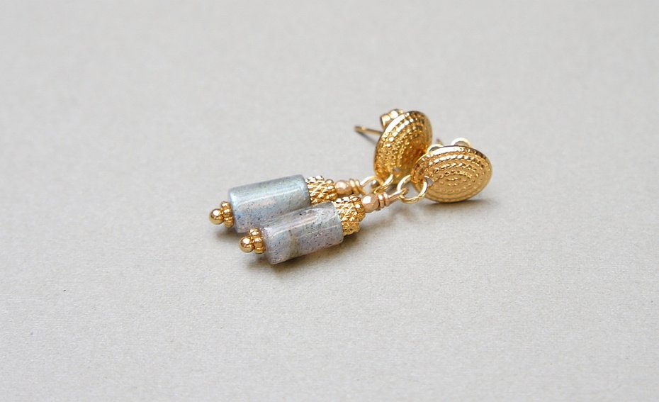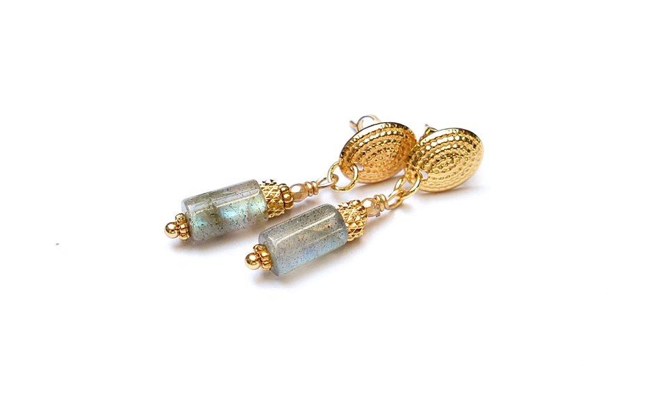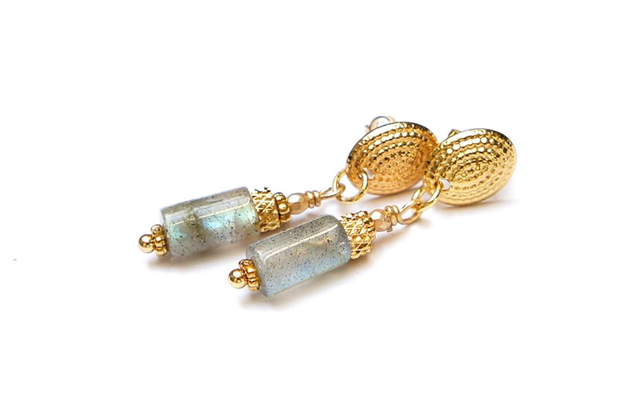 Delikatne kolczyki wykonane z naturalnych kamieni - wałeczki labradorytów [9 x 5mm], fasetowanych kuleczek matowego hematytu [2mm] oraz z pozłacanej stali szlachetnej. Długość kolczyków: ok. 3cm. Biżuteria ozdobnie zapakowana.