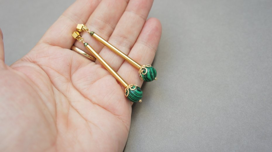 Długie kolczyki wykonane z naturalnych kamieni - malachit fasetowany [10mm], hematyt fasetowany [3mm] oraz z pozłacanej stali szlachetnej. Długość kolczyków: ok. 6cm. Biżuteria ozdobnie zapakowana.