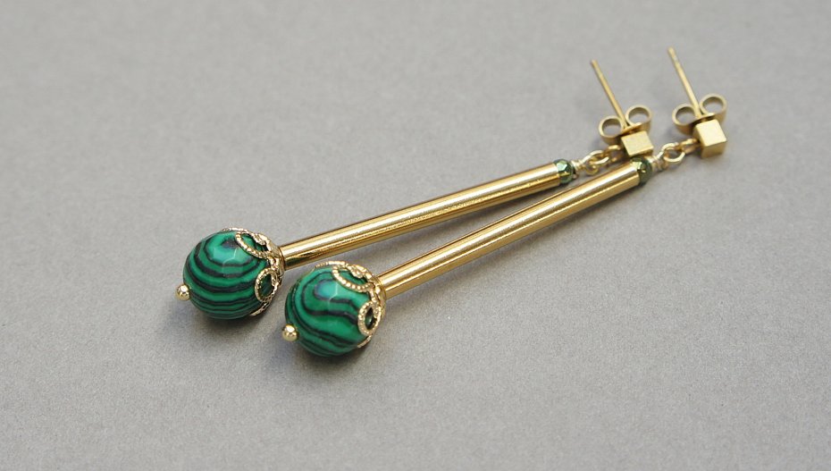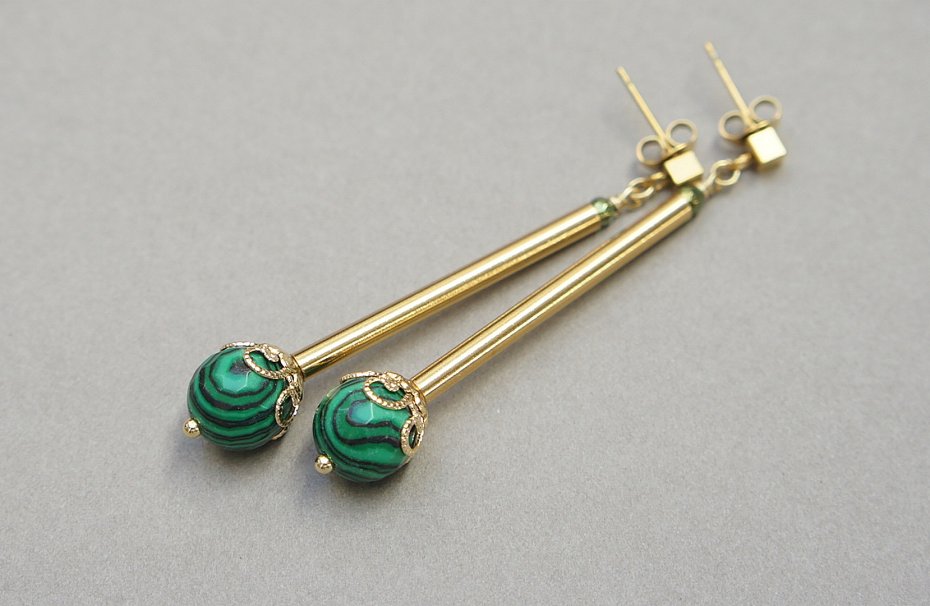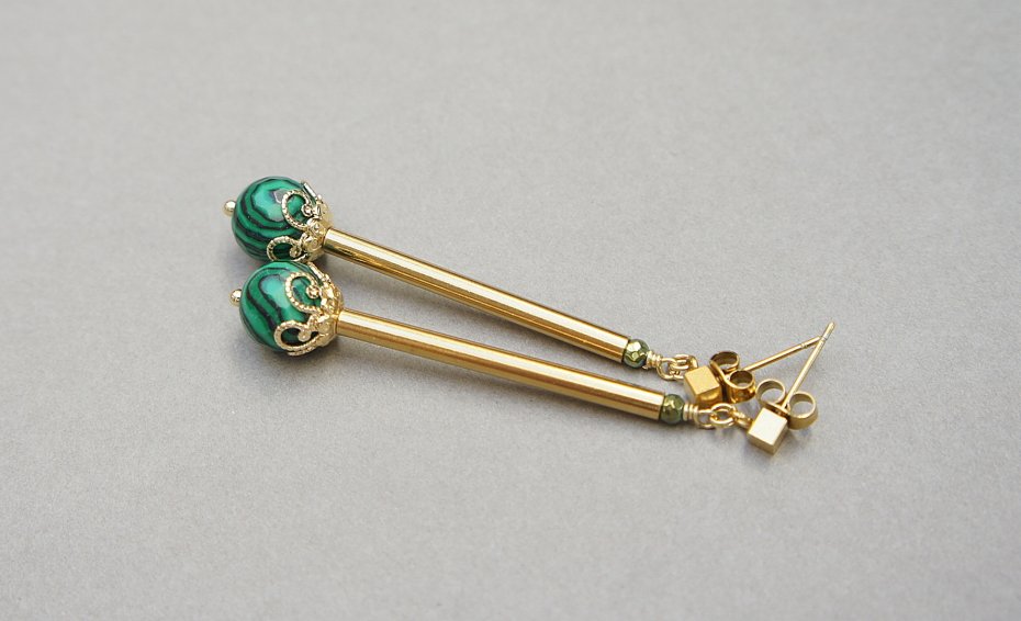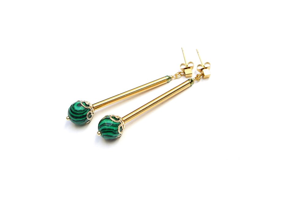 Długie kolczyki wykonane z naturalnych kamieni - malachit fasetowany [10mm], hematyt fasetowany [3mm] oraz z pozłacanej stali szlachetnej. Długość kolczyków: ok. 6cm. Biżuteria ozdobnie zapakowana.