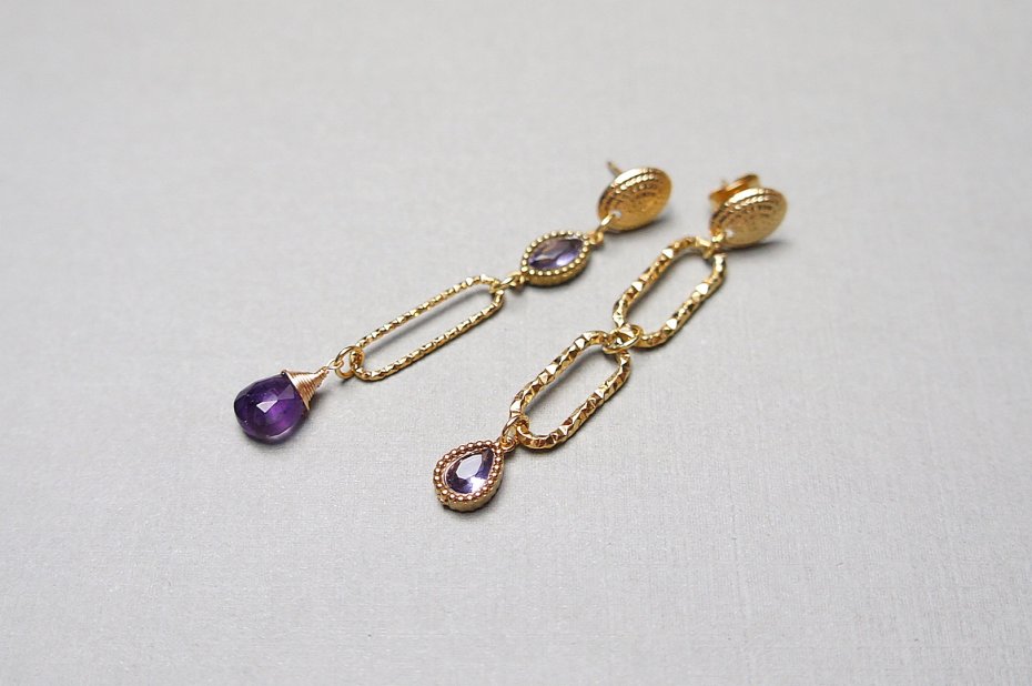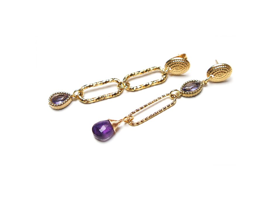 Asymetryczne kolczyki wykonane z pozłacanej stali szlachetnej, brioletki naturalnego ametystu oraz łącznika i zawieszki z cyrkoniami w okuciu. Długość kolczyków: ok. 5,4,1 i 5,8cm.