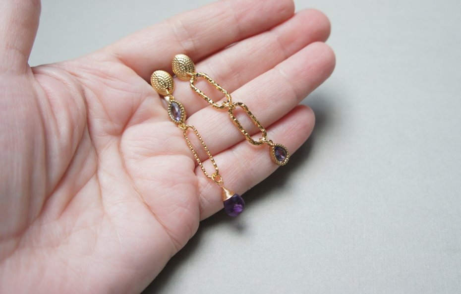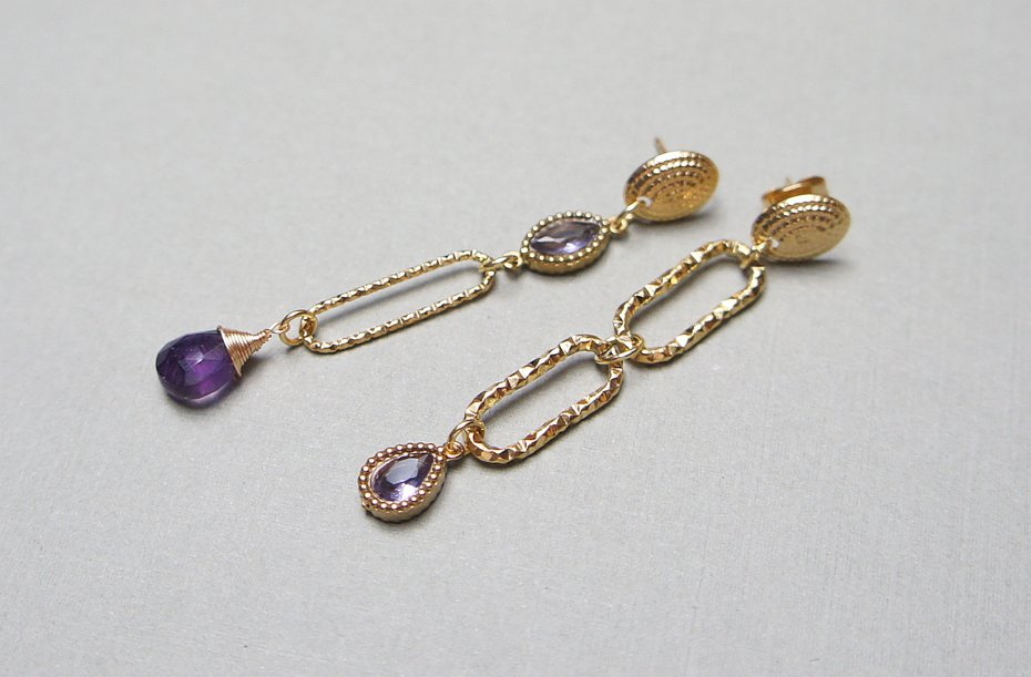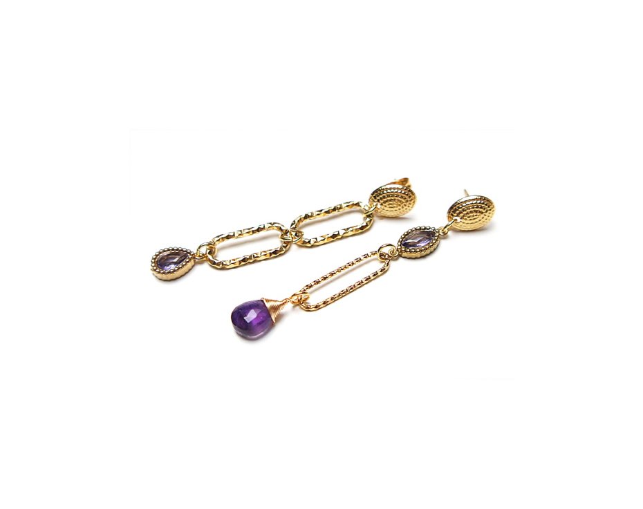 Asymetryczne kolczyki wykonane z pozłacanej stali szlachetnej, brioletki naturalnego ametystu oraz łącznika i zawieszki z cyrkoniami w okuciu. Długość kolczyków: ok. 5,4,1 i 5,8cm.