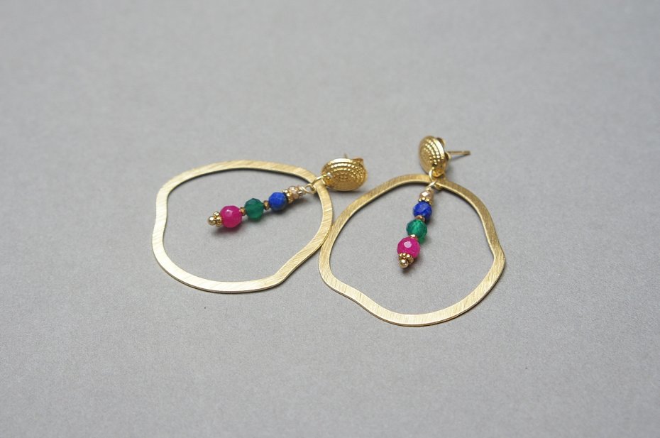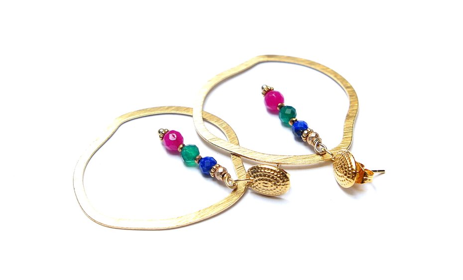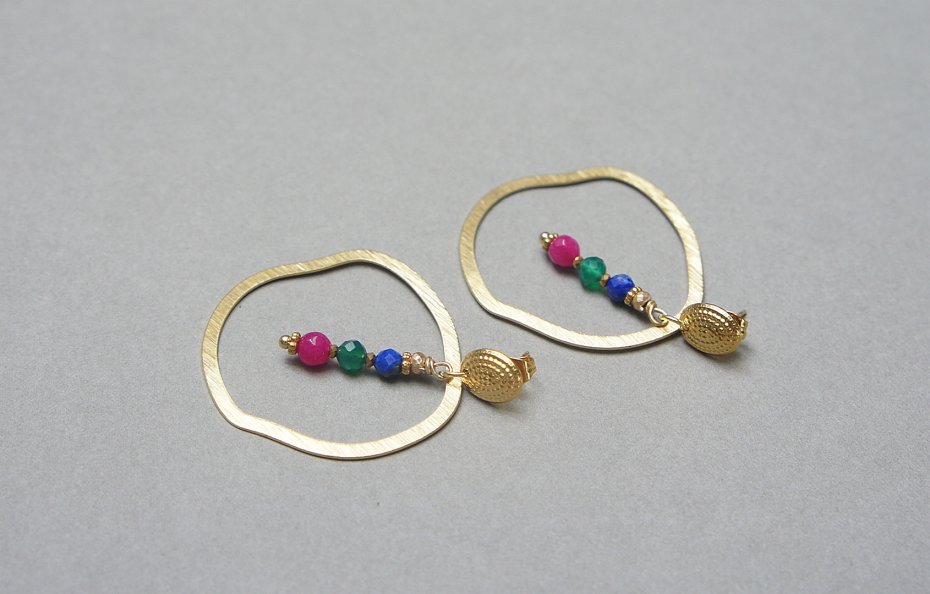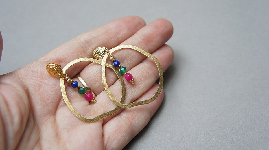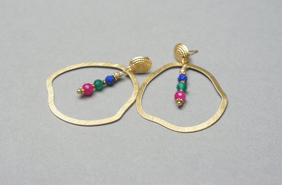 Duże kolczyki wykonane z pozłacanej stali szlachetnej, mosiądzu platerowanego i naturalnych kamieni: lapis lazuli, onyks zielony, jadeity [4mm]. Długość kolczyków: ok. 4,7cm.