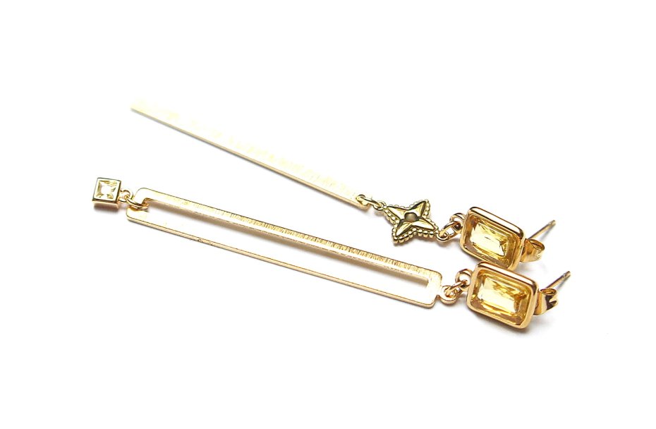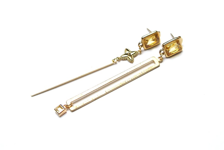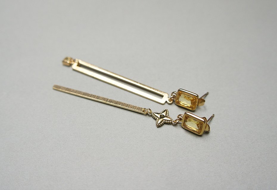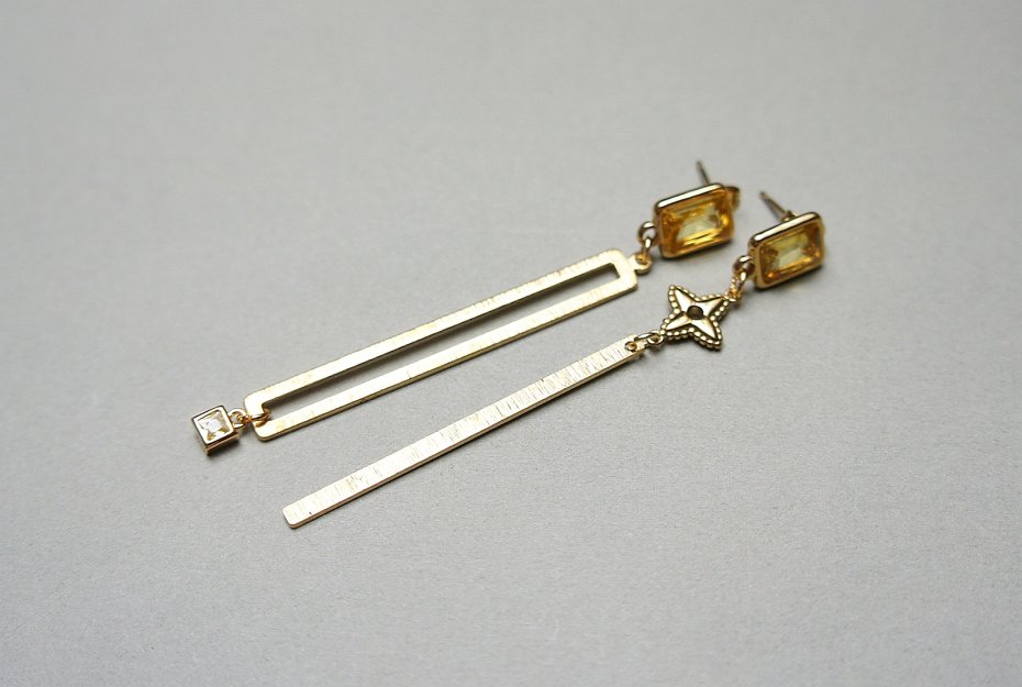 Długie, asymetryczne kolczyki wykonane z pozłacanej stali szlachetnej, mosiądzu, bigli z kryształkami w okuciu oraz zawieszki z cyrkonią w okuciu. Długość kolczyków: ok. 8cm.