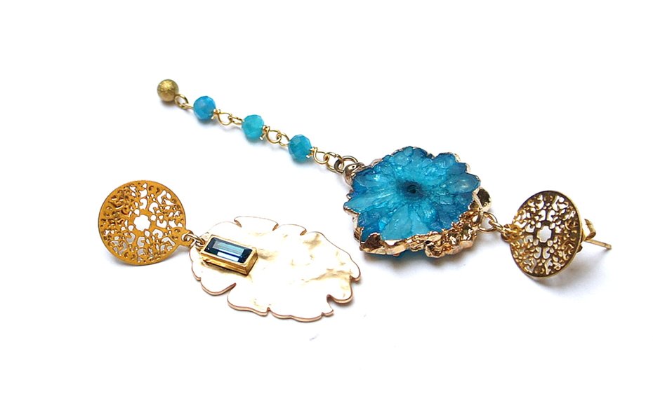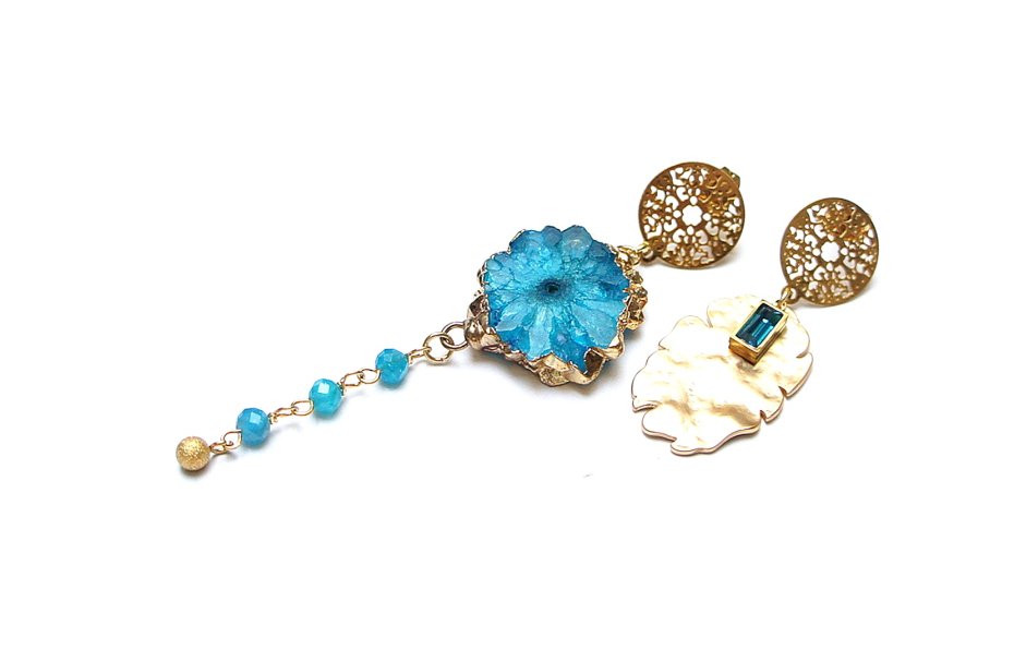 Asymetryczne kolczyki wykonane z pozłacanej stali szlachetnej, mosiądzu platerowanego, druzy agatu, apatytów fasetowanych [4mm], zawieszki z cyrkonią w okuciu. Sztyfty ze stali szlachetnej. Długość kolczyków: ok. 4,5 i 8,5cm. Biżuteria ozdobnie zapakowana.