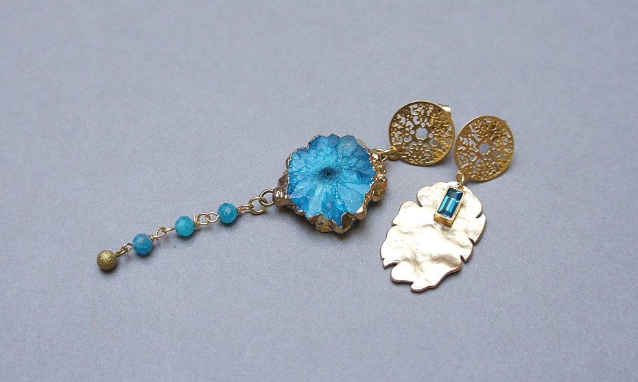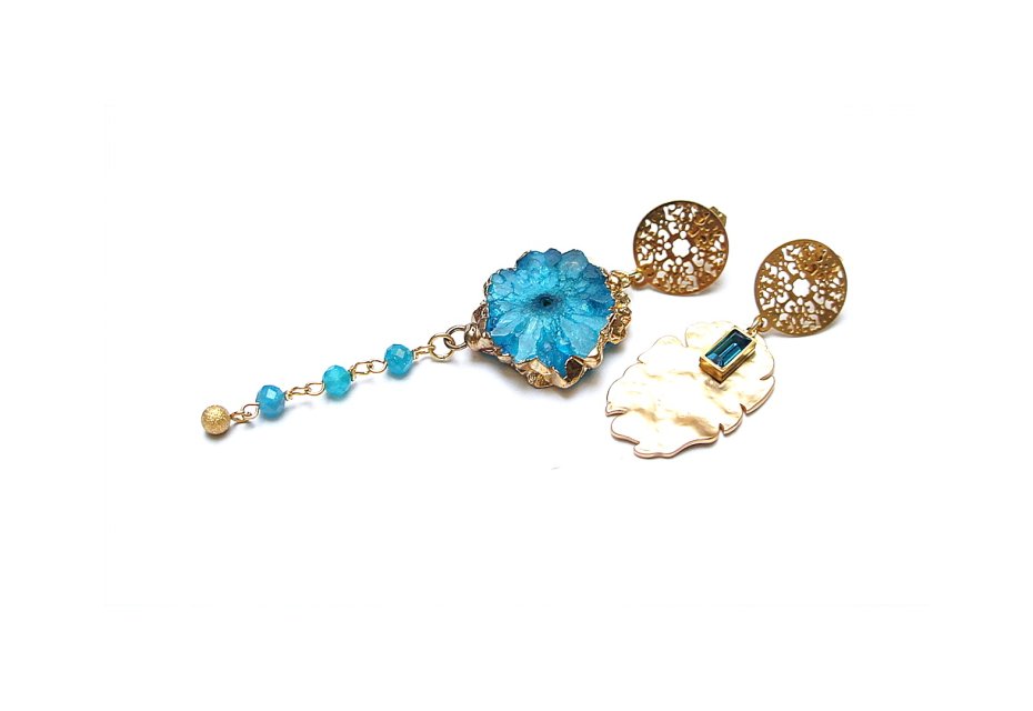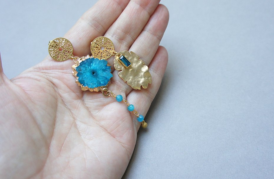 Asymetryczne kolczyki wykonane z pozłacanej stali szlachetnej, mosiądzu platerowanego, druzy agatu, apatytów fasetowanych [4mm], zawieszki z cyrkonią w okuciu. Sztyfty ze stali szlachetnej. Długość kolczyków: ok. 4,5 i 8,5cm. Biżuteria ozdobnie zapakowana.
