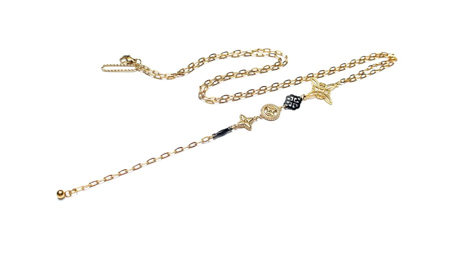 Naszyjnik wykonany z pozłacanej stali szlachetnej oraz stali szlachetnej w kolorze czarnym. Obwód łańcuszka: 66cm. , długość części wiszącej: 16m. Biżuteria ozdobnie zapakowana. Do kompletu można dokupić kolczyki widoczne na zdjęciach.