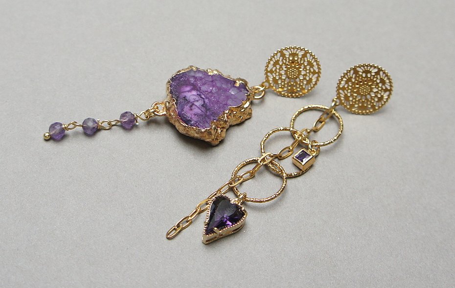 Asymetryczne kolczyki wykonane z pozłacanej stali szlachetnej, druzy agatu, ametystów fasetowanych, zawieszek z cyrkoniami w okuciu. Sztyfty ze stali szlachetnej. Długość kolczyków: ok. 8 i 7,5cm. Biżuteria ozdobnie zapakowana.