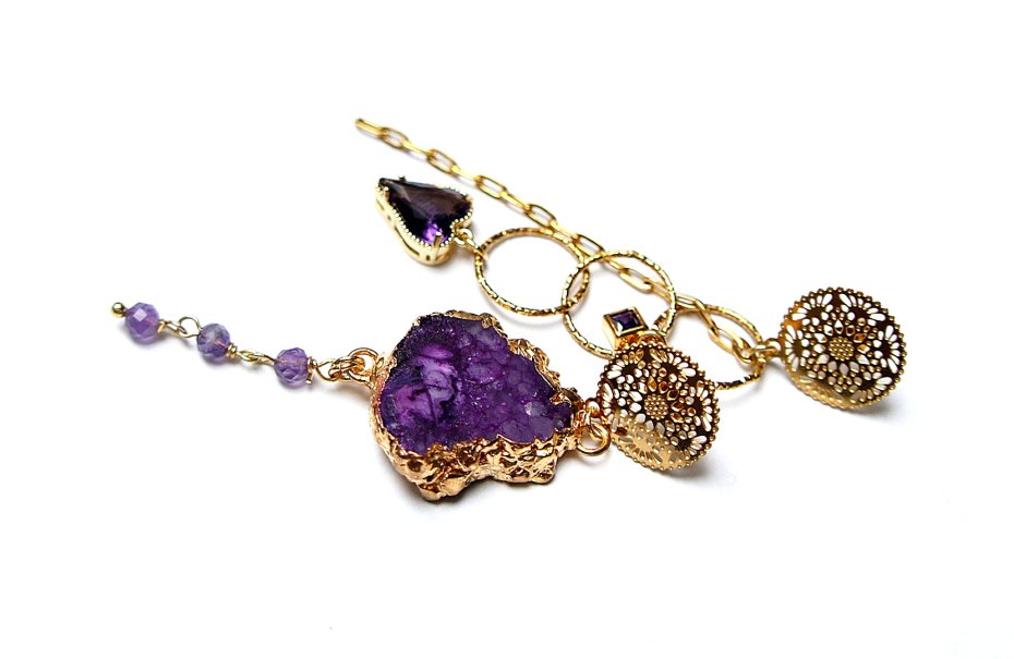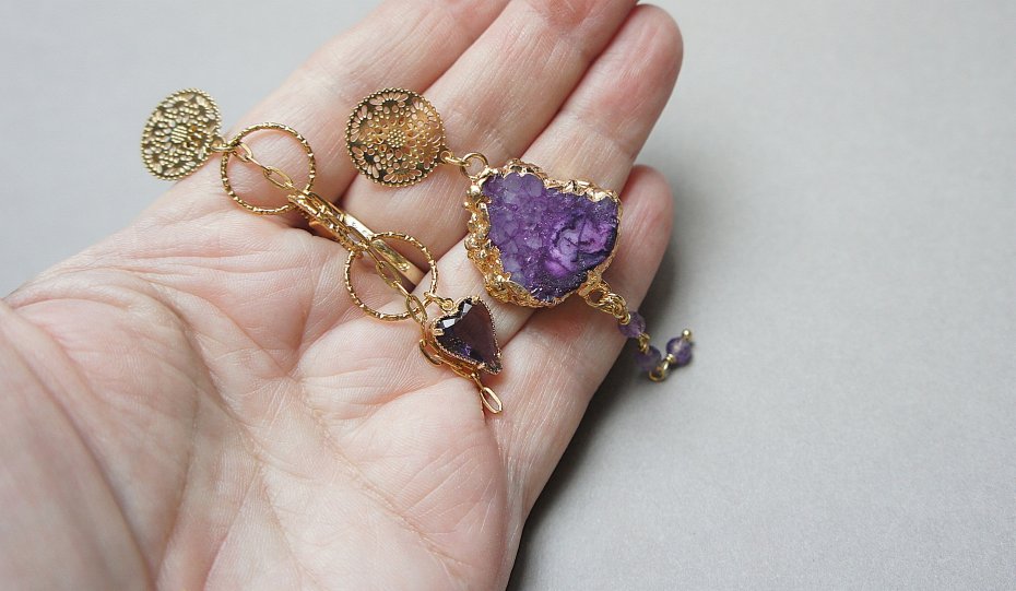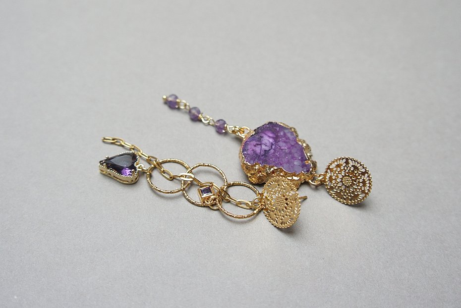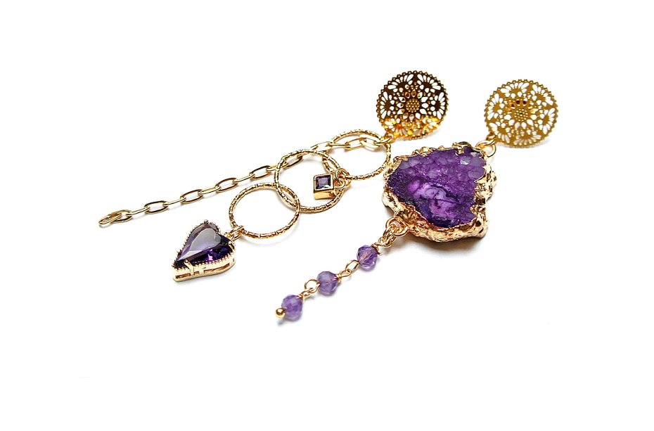 Asymetryczne kolczyki wykonane z pozłacanej stali szlachetnej, druzy agatu, ametystów fasetowanych, zawieszek z cyrkoniami w okuciu. Sztyfty ze stali szlachetnej. Długość kolczyków: ok. 8 i 7,5cm. Biżuteria ozdobnie zapakowana.
