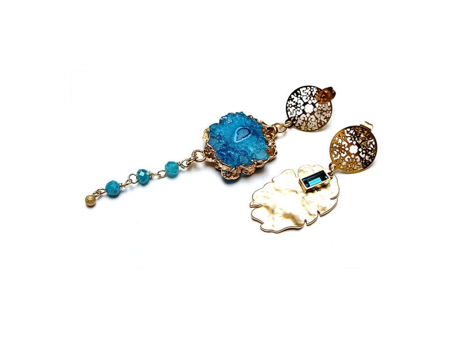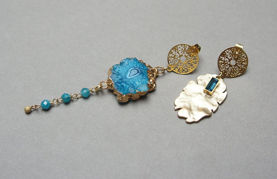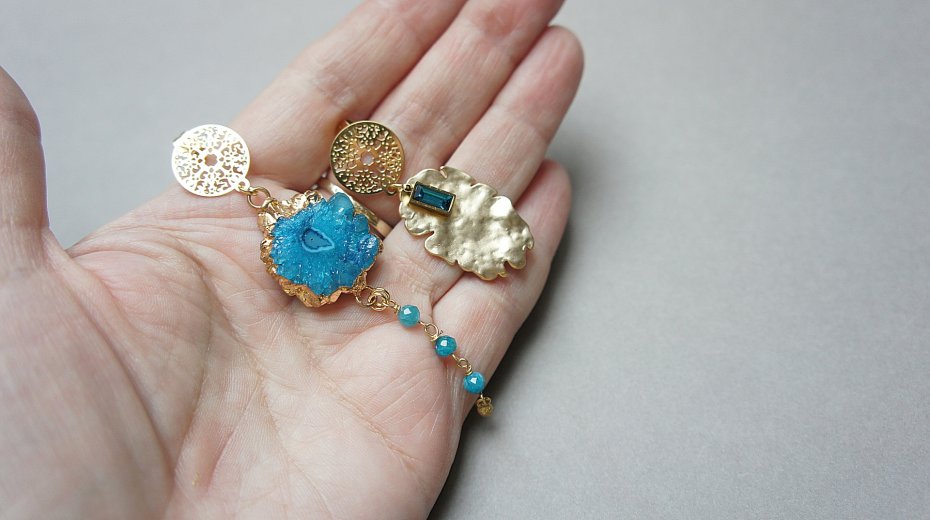 Asymetryczne kolczyki wykonane z pozłacanej stali szlachetnej, mosiądzu platerowanego, druzy agatu, apatytów fasetowanych [4mm], zawieszki z cyrkonią w okuciu. Sztyfty ze stali szlachetnej. Długość kolczyków: ok. 4,5 i 8,5cm. Biżuteria ozdobnie zapakowana.