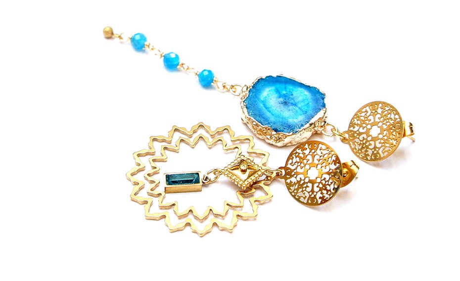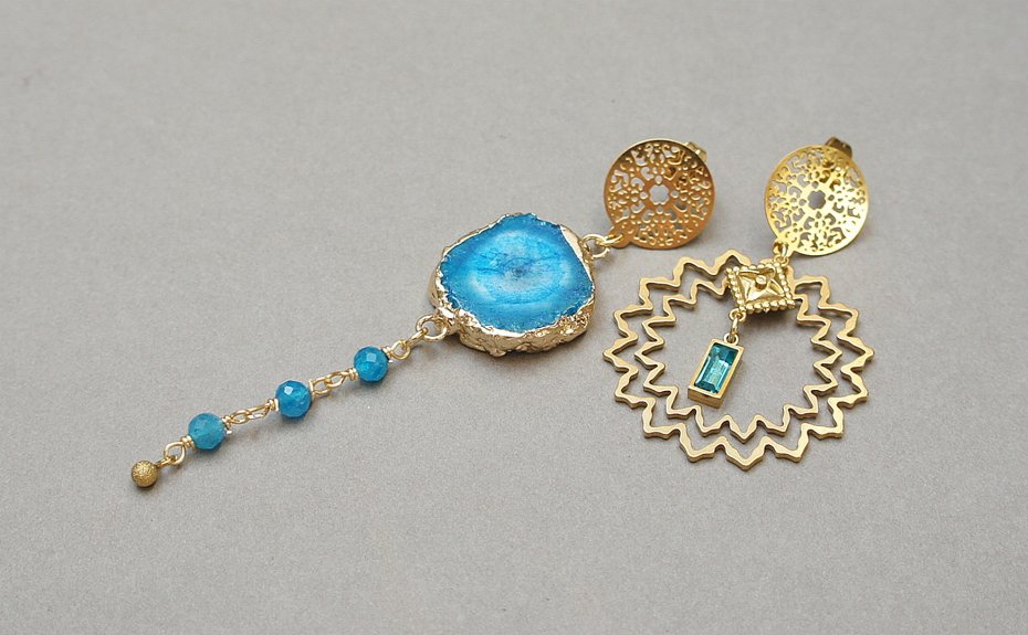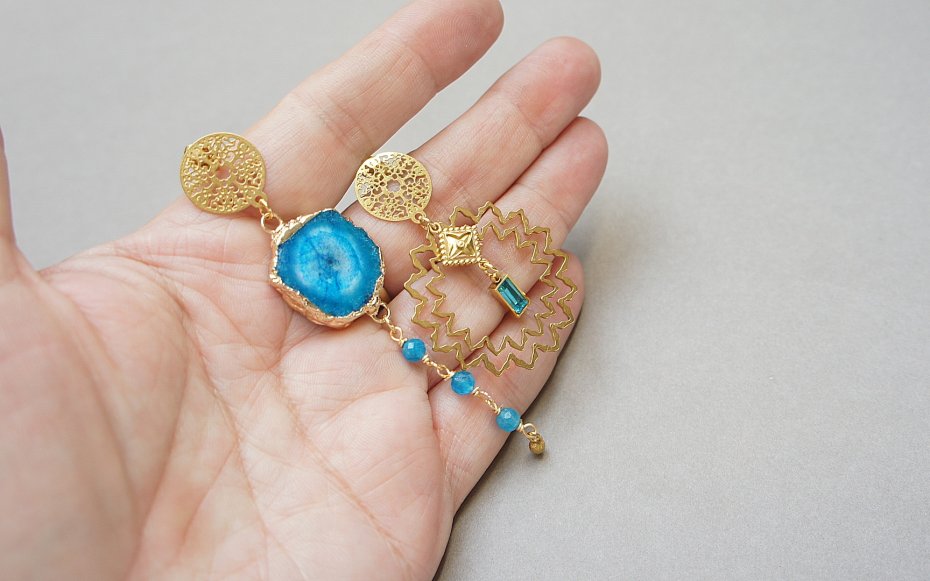 Asymetryczne kolczyki wykonane z pozłacanej stali szlachetnej, druzy agatu, fasetowanych kuleczek apatytu [4mm], ażurowego łącznika z mosiądzu [32mm], zawieszki z cyrkonią w okuciu. Sztyfty ze stali szlachetnej. Długość kolczyków: ok. 4,5cm i 8cm. Biżuteria ozdobnie zapakowana.
