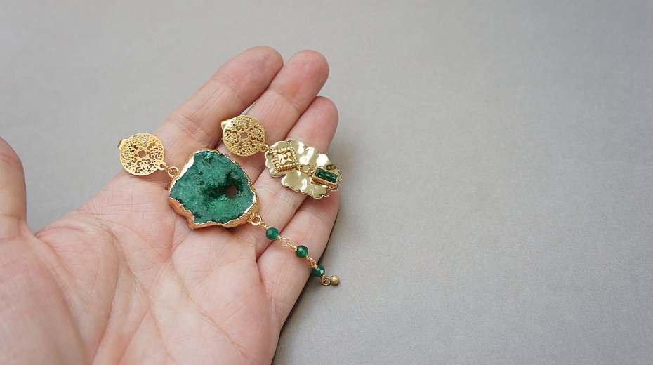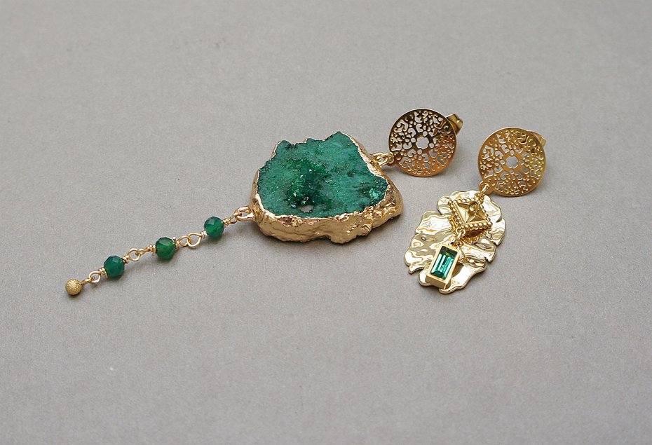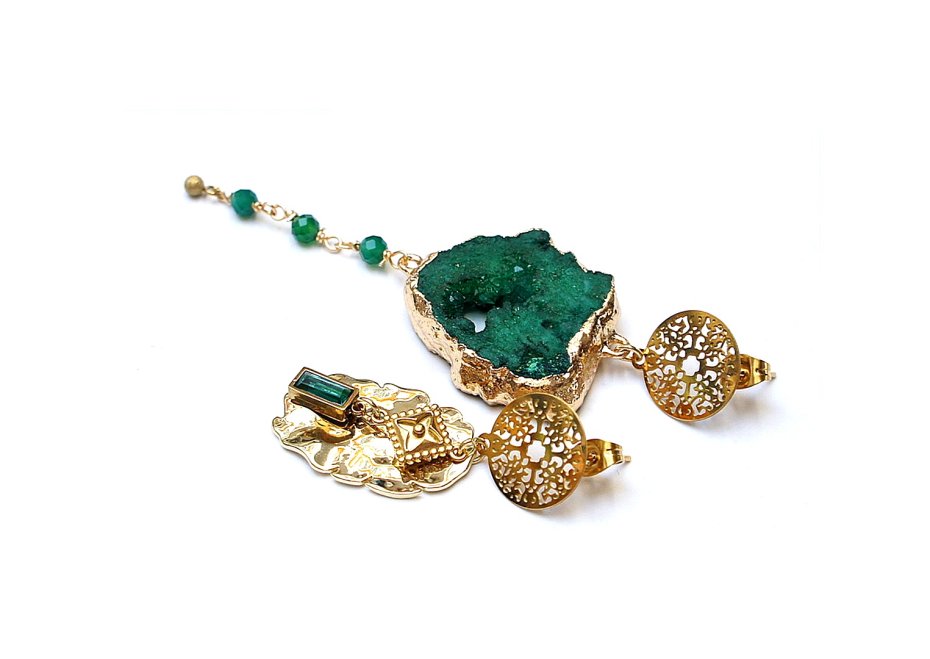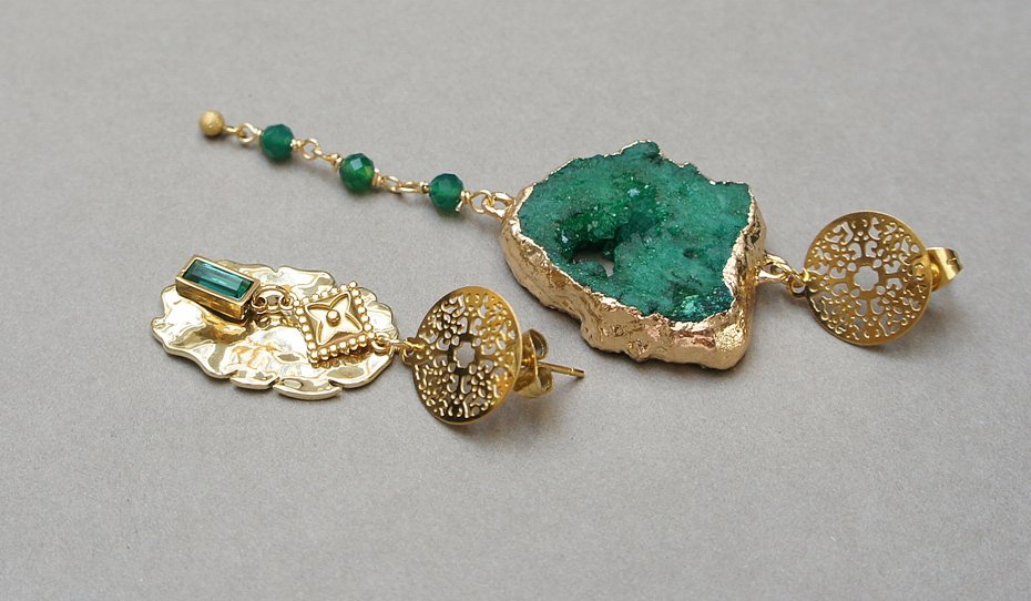Asymetryczne kolczyki wykonane z pozłacanej stali szlachetnej, druzy agatu, fasetowanych kuleczek zielonego onyksu [4mm], nieregularnej blaszki z platerowanego mosiądzu [25mm], zawieszki z cyrkonią w okuciu. Sztyfty ze stali szlachetnej. Długość kolczyków: ok. 4,3cm i 8,6cm. Biżuteria ozdobnie zapakowana.