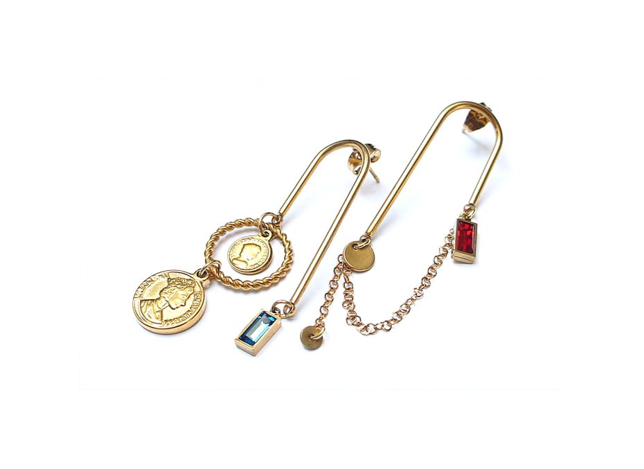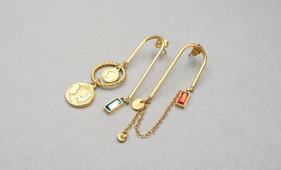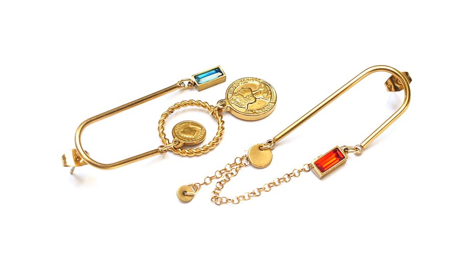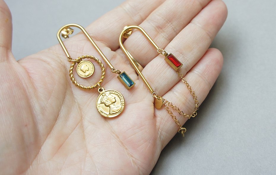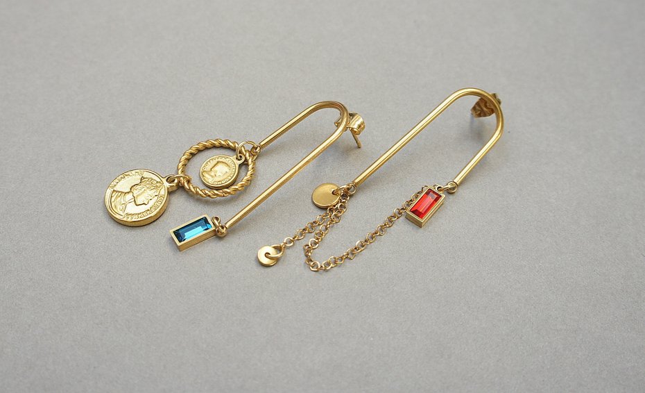 Asymetryczne kolczyki wykonane z pozłacanej stali szlachetnej. Cyrkonie w okuciu. Długość kolczyków: ok. 5,7cm i 6,3cm.