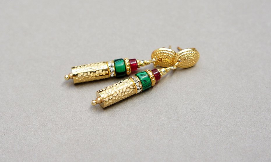 Kolczyki wykonane z naturalnych kamieni - talarki malachitów [6 x 3mm], talarki jadeitów [4 x 2mm] oraz z pozłacanej stali szlachetnej. Długość kolczyków: ok. 4,3cm. Biżuteria ozdobnie zapakowana.