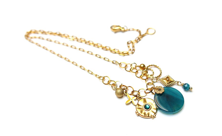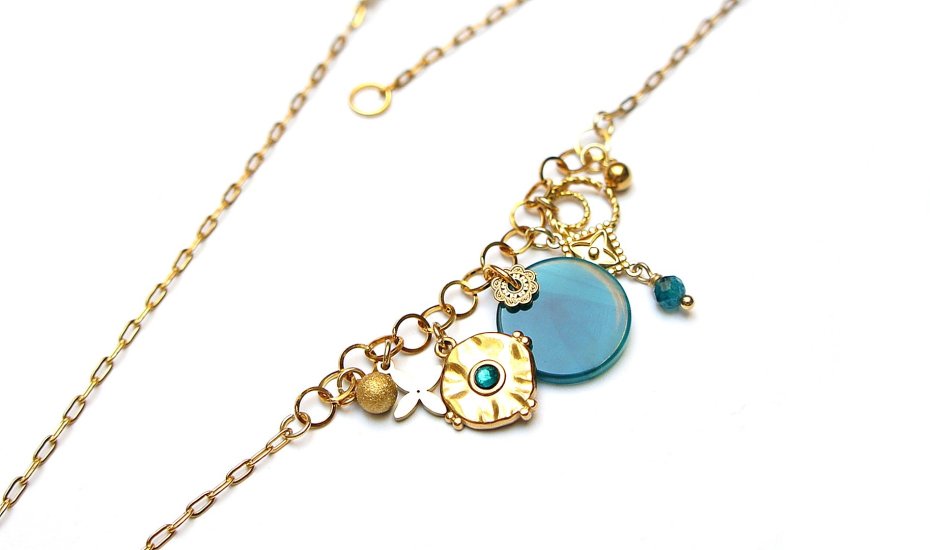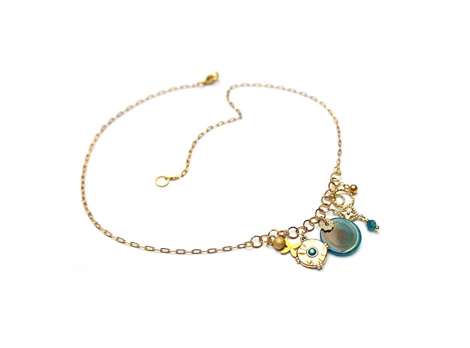 Krótki naszyjnik wykonany w całości ze stali szlachetnej pozłacanej w połączeniu z monetką żywicy [16mm], apatytem fasetowanym [4mm] oraz zawieszkami (w tym zawieszka z kryształkiem Swarovski). Całkowita długość naszyjnika ok. 42,5cm. Biżuteria ozdobnie zapakowana.