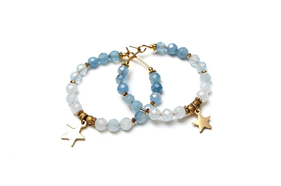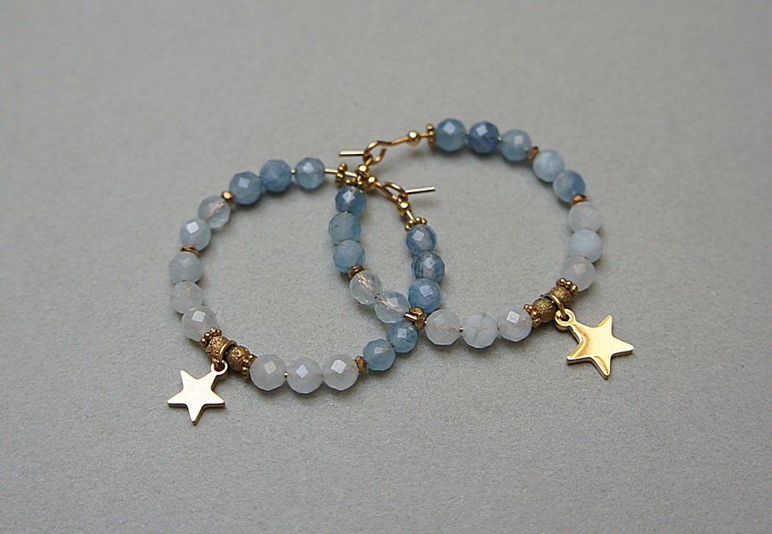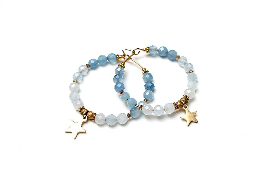 Kolczyki wykonane ze stali szlachetnej pokrytej zlotem oraz naturalnych kamieni - kuleczek akwamarynu fasetowanego ombre [3,5mm]. Średnica kół 30mm. Biżuteria ozdobnie zapakowana.