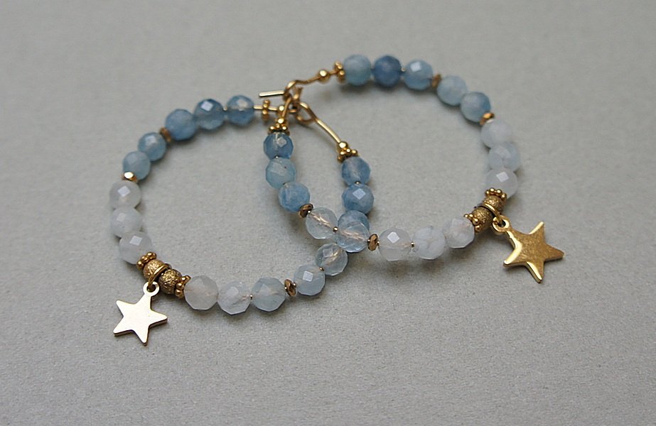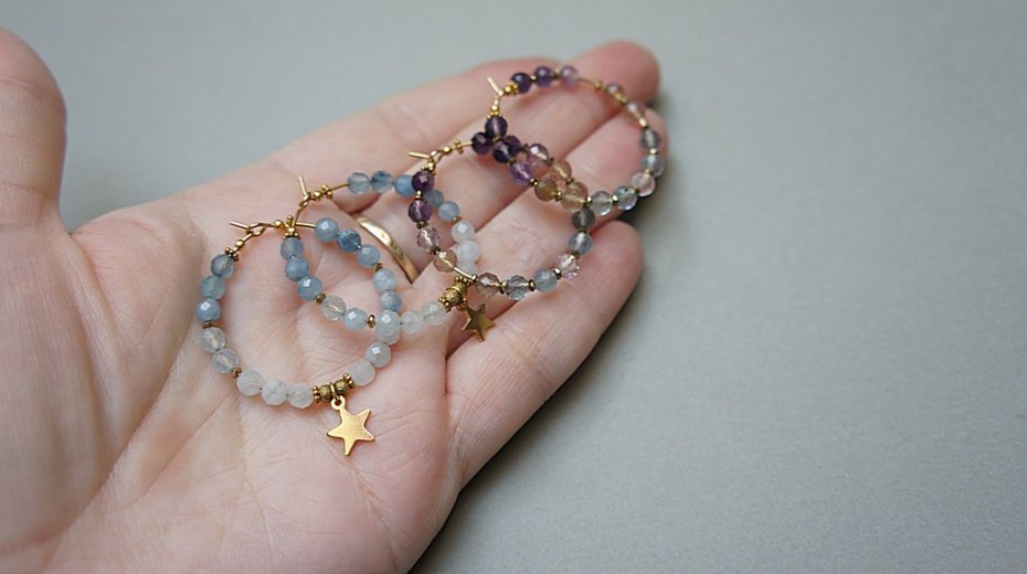 Kolczyki wykonane ze stali szlachetnej pokrytej zlotem oraz naturalnych kamieni - kuleczek akwamarynu fasetowanego ombre [3,5mm]. Średnica kół 30mm. Biżuteria ozdobnie zapakowana.