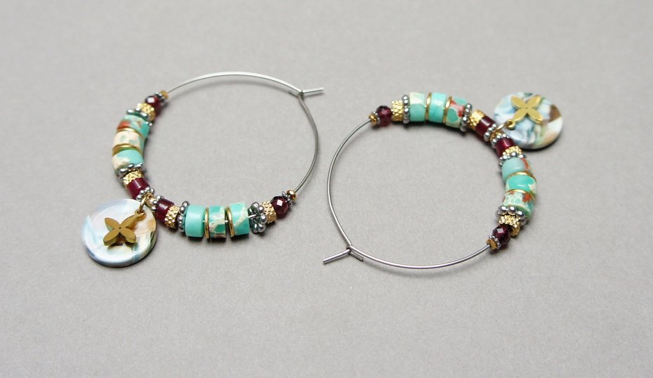 Kolczyki wykonane ze stali szlachetnej pokrytej zlotem, kuleczek fasetowanych labradorytów [3mm], oponek fasetowanych labradorytów [3 x 2mm] oraz przekładek z hematytu [1mm oraz 3 x 2mm]. Średnica kół 30mm. Biżuteria ozdobnie zapakowana.