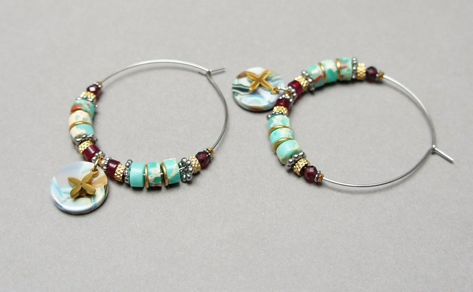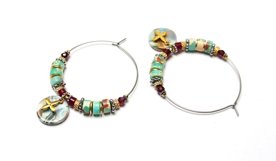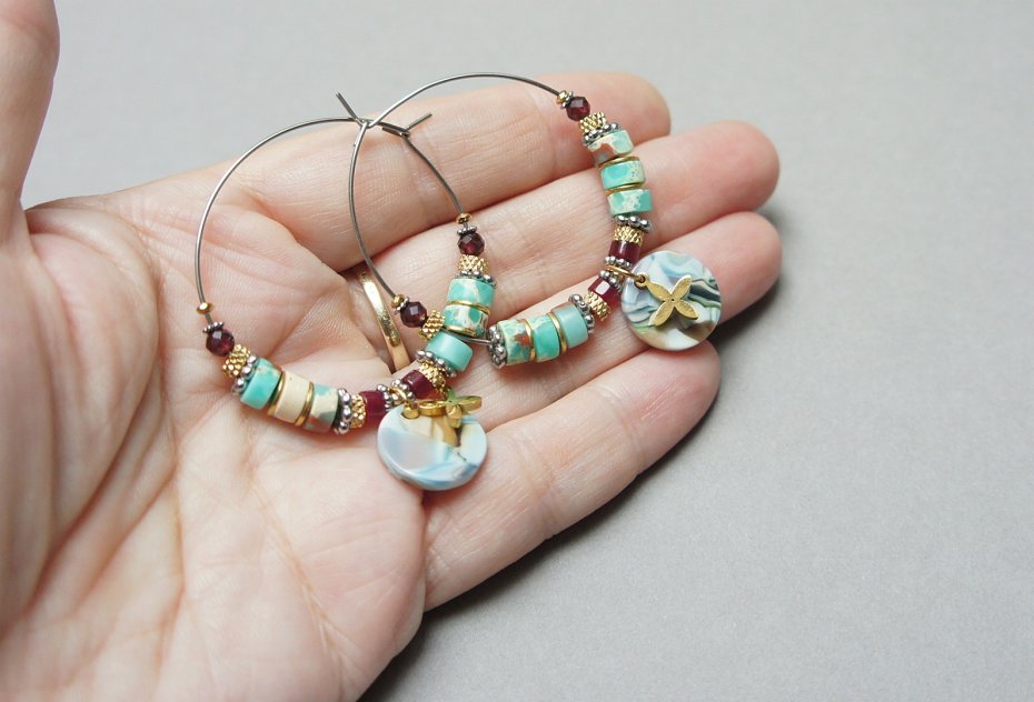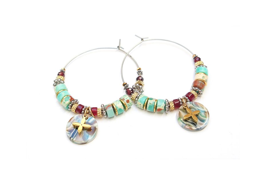 Kolczyki wykonane ze stali szlachetnej pokrytej zlotem, kuleczek fasetowanych labradorytów [3mm], oponek fasetowanych labradorytów [3 x 2mm] oraz przekładek z hematytu [1mm oraz 3 x 2mm]. Średnica kół 30mm. Biżuteria ozdobnie zapakowana.