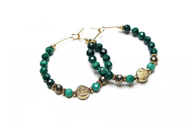 Kolczyki wykonane ze stali szlachetnej pokrytej zlotem oraz naturalnych minerów - fasetowany malachit [3mm], fasetowany piryt o surowym wyglądzie [3mm], przekładek z hematytu [1mm i 6mm - kwiatki] Średnica kół 30mm.