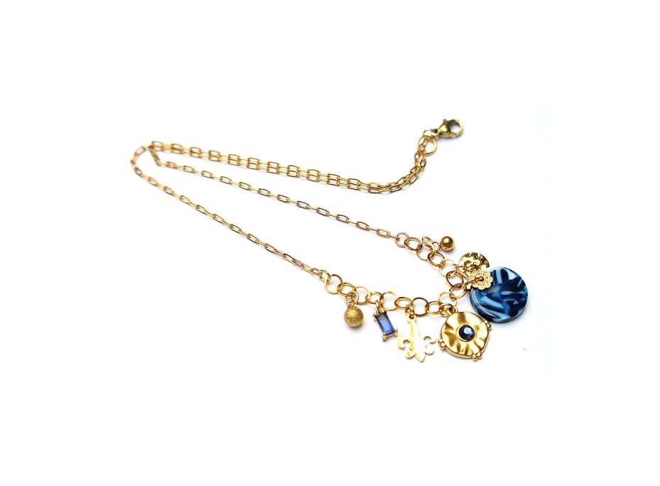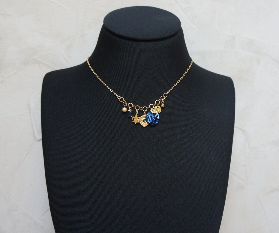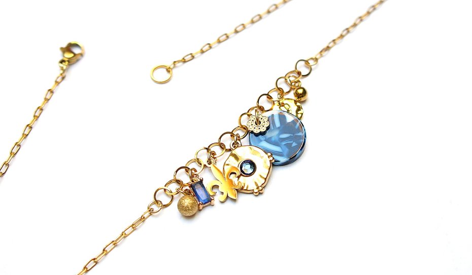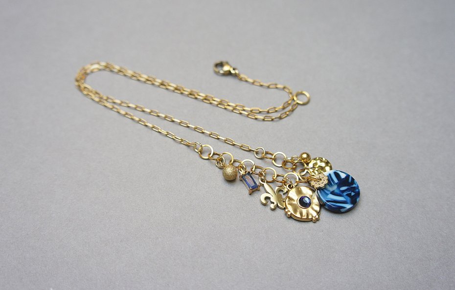 Krótki naszyjnik wykonany w całości ze stali szlachetnej pozłacanej w połączeniu z monetką żywicy [15mm],cyrkonią w okuciu , oraz zawieszkami. Całkowita długość naszyjnika ok. 42,5cm. Biżuteria ozdobnie zapakowana.
