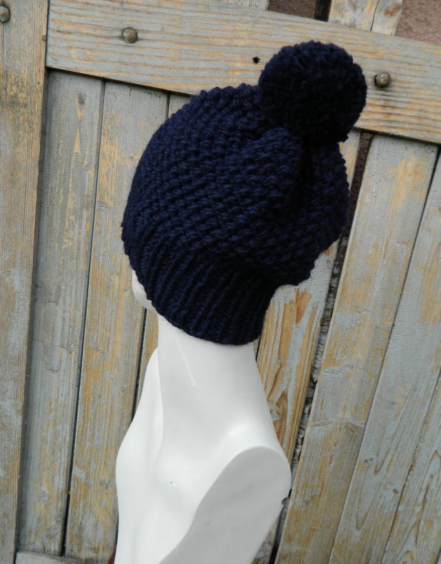 Ciepła granatowa czapa z pomponem, model UNISEX. Zrobiłam ją z peruwiańskiej włóczki świetnej gatunkowo: 65% wełny owczej i 35% alpaki (wełna z lamy). Czapa jest gruba, mięsista, ciepła i miła w dotyku, świetnie leży na głowie.