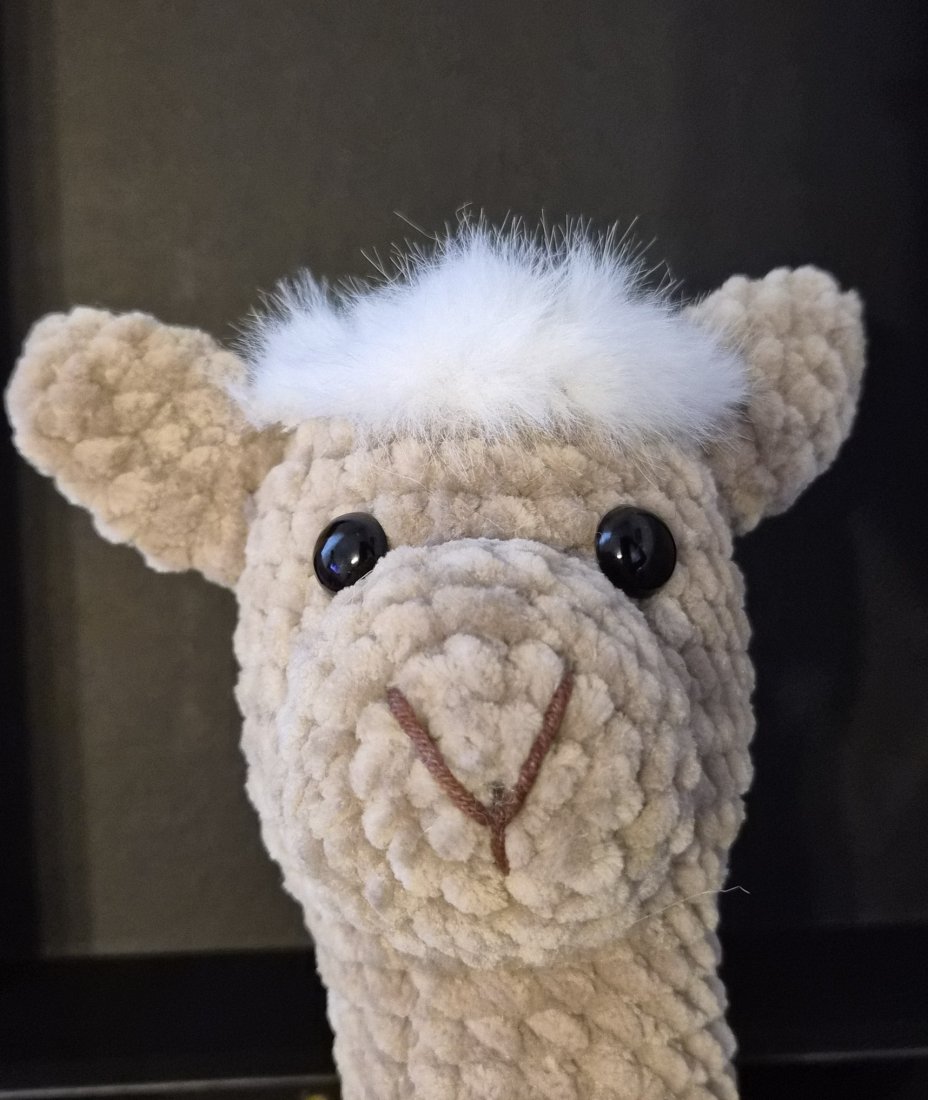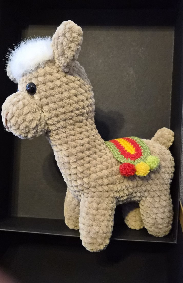 Wykonana na szydełku z welurowej włóczki, wypełniona włóknem silikonowym. Wysokość: ok. 24 cm
