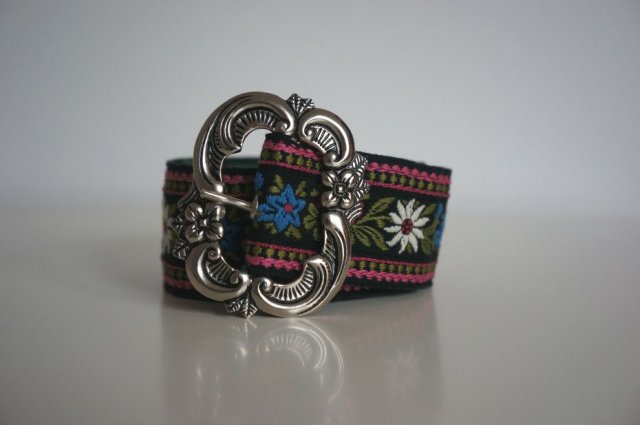 Ładny, damski pasek z wyhaftowanymi szarotkami alpejskimi. Śliczna, ozdobna, metalowa klamra. Stan dobry.