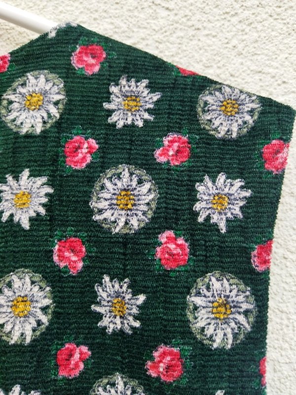 Kamizelka z miłej tkaniny z fakturą a' la sztruks z  wzorem  szarotek i róż w kolorystyce bieli, różu , czerwieni i żółci  na zielonym tle. Taliowana z dwiema wpuszczanymi kieszonkami z przodu, z małymi rozcięciami z tyłu u dołu. Zapinana na rogowe guziki. Całość na podszewce