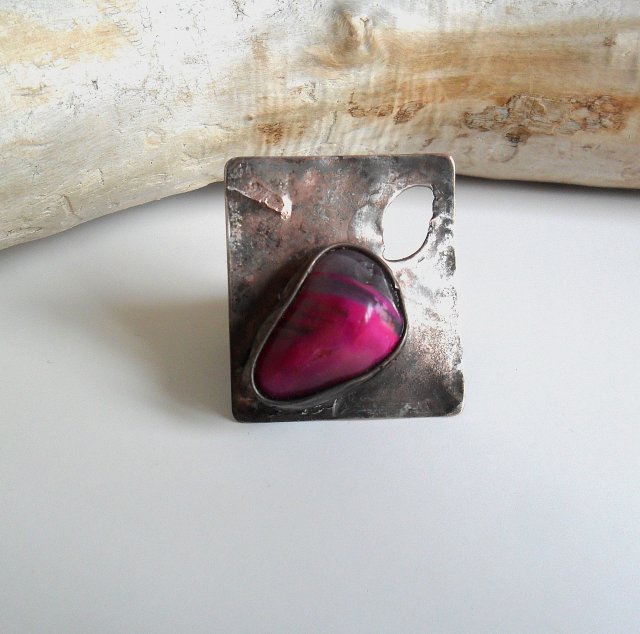 Pierścionek z agatem w pieknym różu.Miedz,młotkowana i patynowana.Wymiary tarczy 3/3,5cm Solidna,regulowana obrączka.