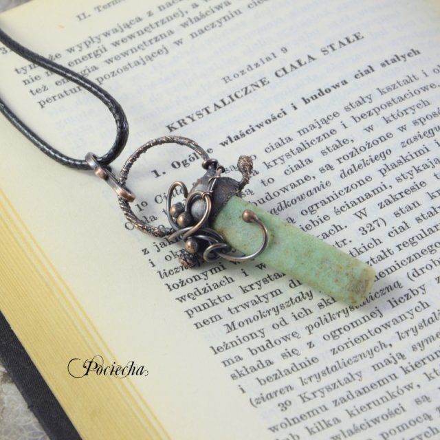 Piękny surowy w formie naszyjnik z wisiorem. Wisior stworzony ręcznie z miedzi oraz lekko surowego amazonitu.. Wisior powstał dzięki technice elektroformowania miedzią z elementami wire wrappingu. Całość patynowana na ciemny kolor i polerowana. Wymiary samego wisiora to ok. 5,7 ( długość ) 2,6 cm (szerokość ). Wisior zawiesiłam na czarnym sznurze jubilerskim. Zapięcie ręcznie robione typu haczyk. Obwód ok. 60 cm.