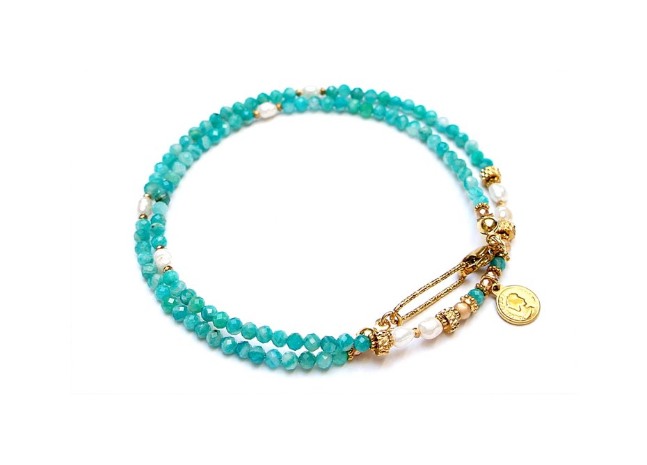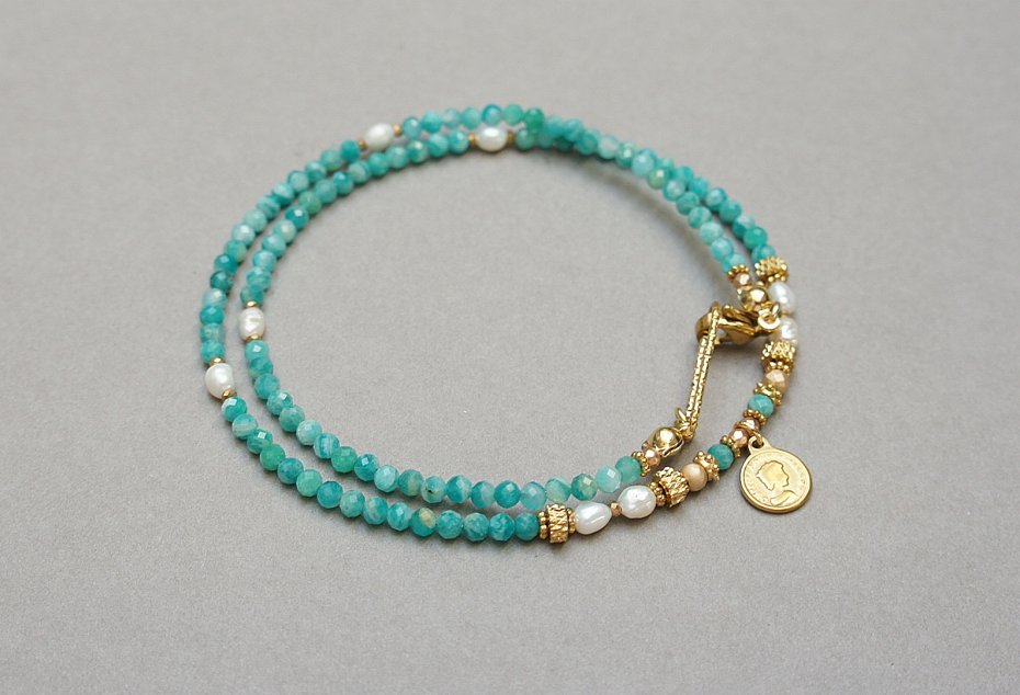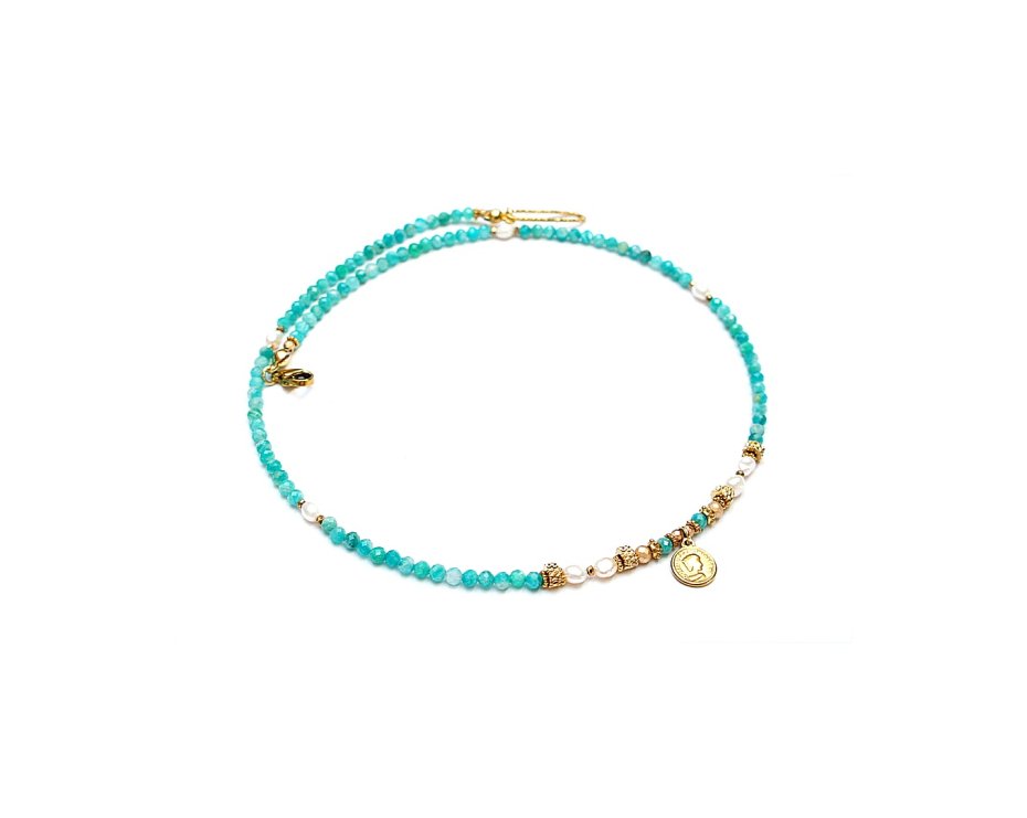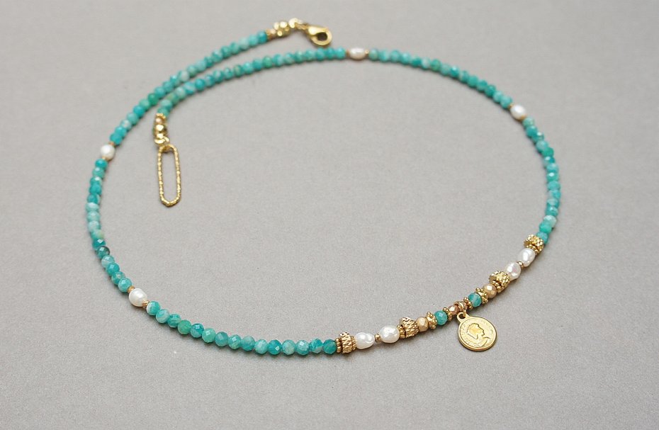 Krótki, delikatny naszyjnik wykonany w całości z pozłacanej stali szlachetnej oraz naturalnych, szlachetnych kamieni - fasetowanych, rzadkich amazonitów rosyjskich [2,5mm], pereł słodkowodnych [ok. 4mm], fasetowanych, platerowanych hematytów [2mm i 3mm], przekładek z hematytu [1mm]. Naszyjnik o długości ok. 42,5cm.