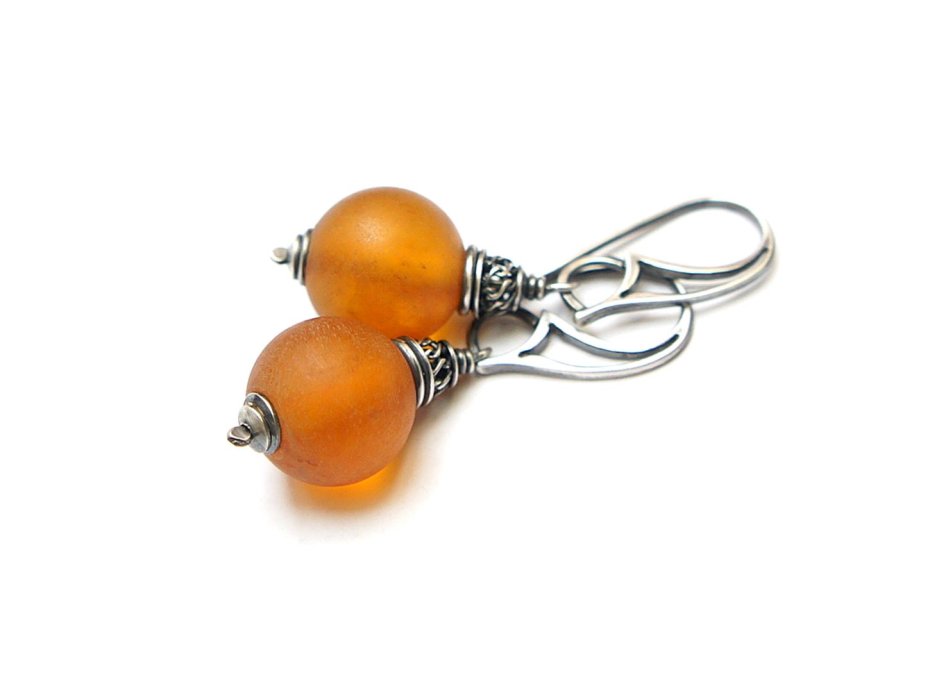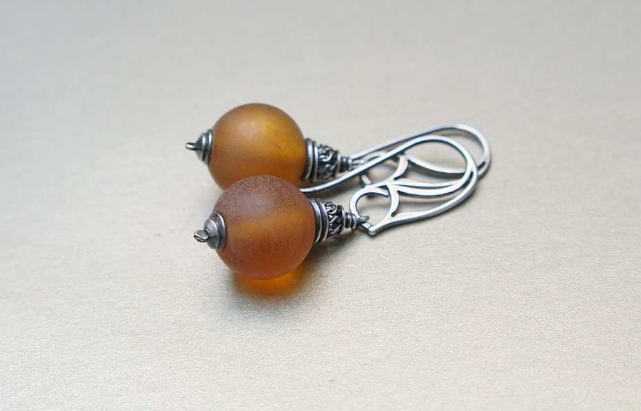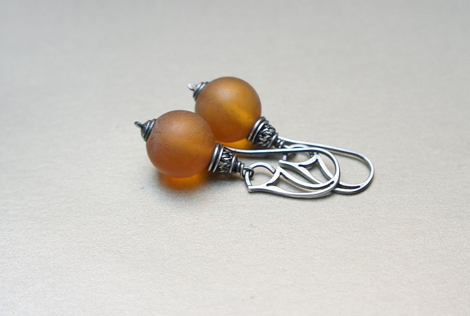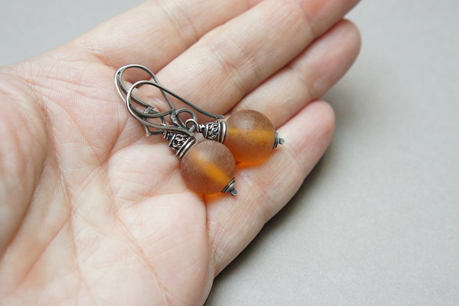 Kolczyki wykonane ze srebra [pr. 925] w połączeniu z kulami naturalnych matowych bursztynów [14mm]. Srebro o oksydowane i przetarte. Całkowita długość kolczyków 4,5cm. Biżuteria ozdobnie zapakowana.