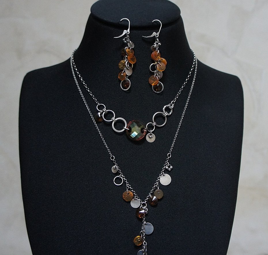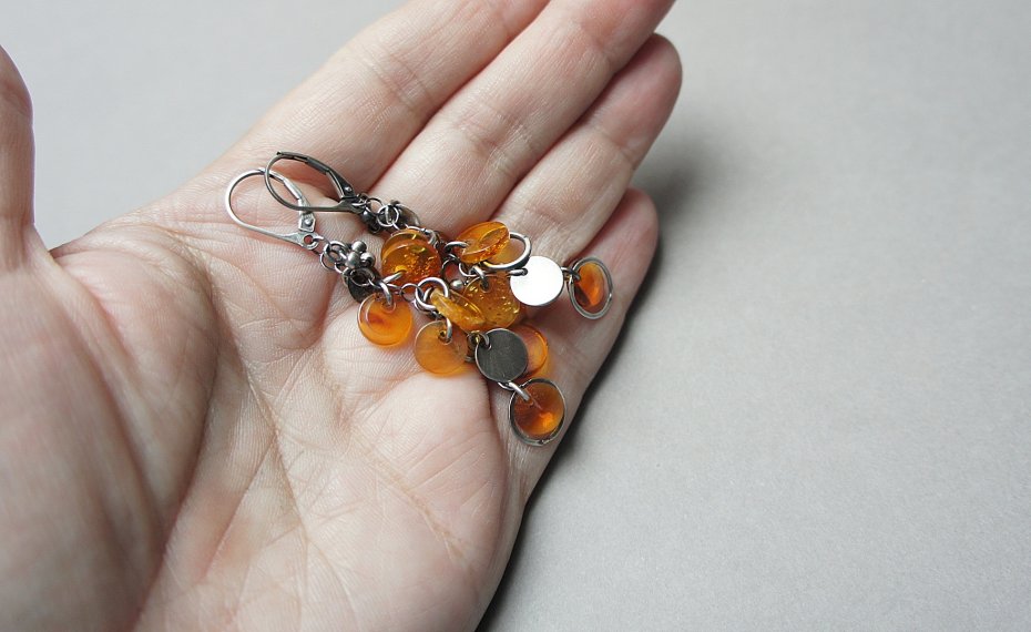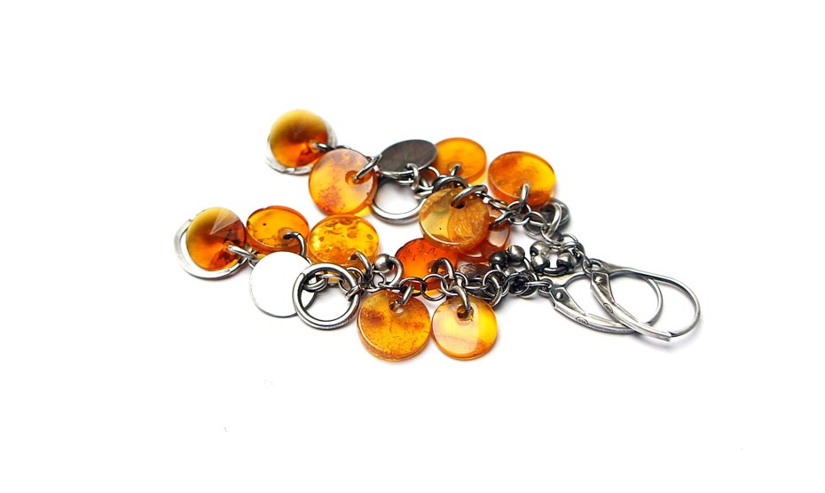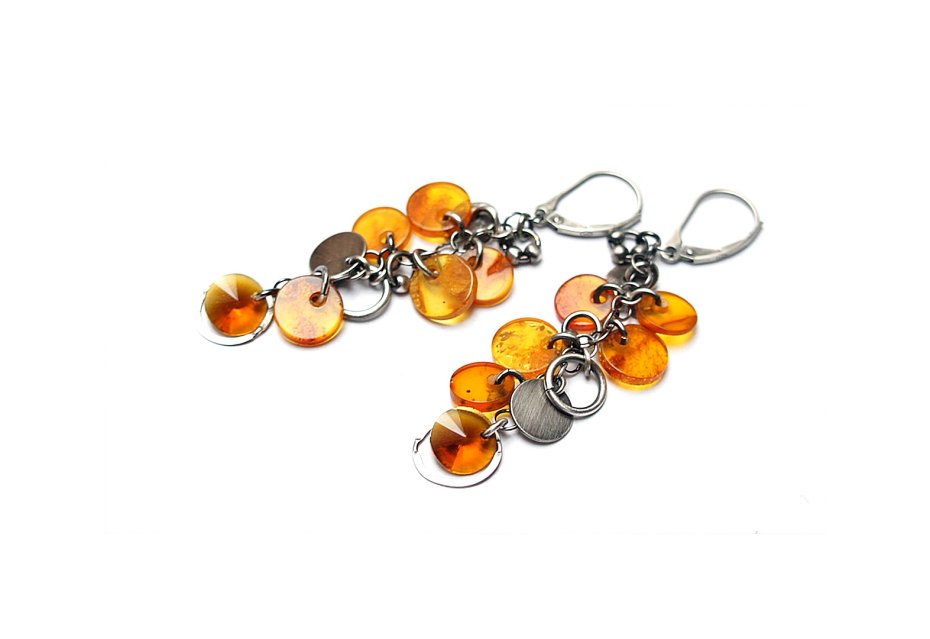 Kolczyki wykonane ze srebra [pr. 925] w połączeniu z pastylkami bursztynów [7-9mm] oraz srebrnymi blaszkami i ogniwami. Całkowita długość kolczyków 6,8. Biżuteria ozdobnie zapakowana.